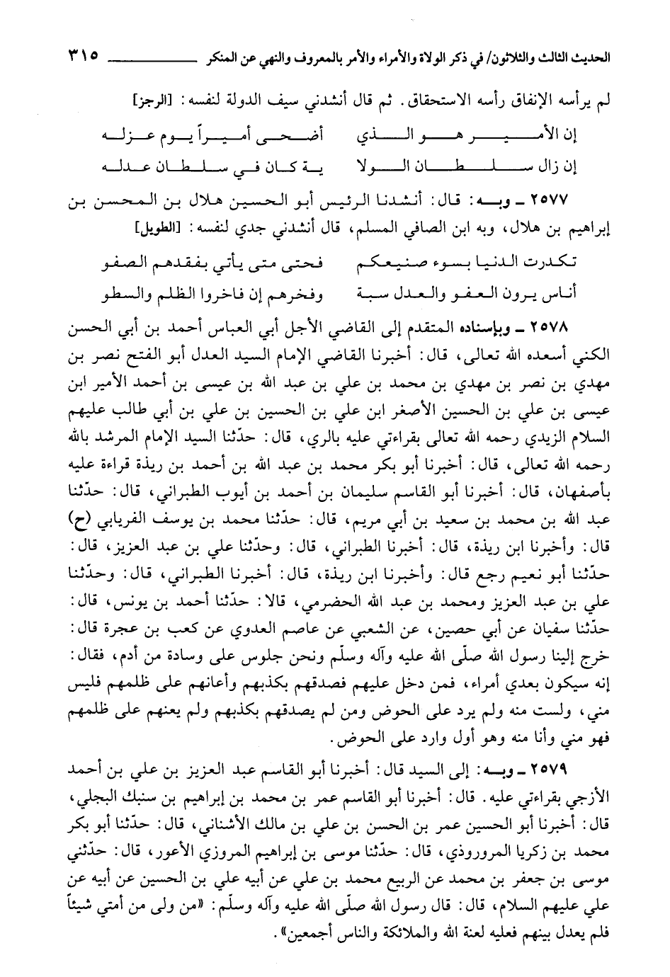 2579 - أَخْبَرَنَا أَبُو الْقَاسِمِ عَبْدُ الْعَزِيزِ بْنُ عَلِيِّ بْنِ أَحْمَدَ الْأَزَجِيُّ , بِقِرَاءَتِي عَلَيْهِ، قَالَ: أَخْبَرَنَا أَبُو الْقَاسِمِ عُمَرُ بْنُ مُحَمَّدِ بْنِ إِبْرَاهِيمَ بْنِ سُنْبُكٍ الْبَجَلِيُّ، قَالَ: أَخْبَرَنَا أَبُو الْحُسَيْن عُمَرُ بْنُ الْحَسَنِ بْنِ عَلِيِّ بْنِ مَالِكٍ الْأُشْنَانِيُّ، قَالَ: حَدَّثَنَا أَبُو بَكْرٍ مُحَمَّدُ بْنُ زَكَرِيَّا الْمَرْوَرَوْزِيُّ، قَالَ: حَدَّثَنَا مُوسَى بْنُ إِبْرَاهِيمَ الْمَرْوَزِيُّ الْأَعْوَرُ، قَالَ: حَدَّثَنِي مُوسَى بْنُ جَعْفَرِ بْنِ مُحَمَّدٍ، عَنِ الرَّبِيعِ مُحَمَّدِ بْنِ عَلِيٍّ، عَنْ أَبِيهِ عَلِيِّ بْنِ الْحُسَيْنِ، عَنْ أَبِيهِ، عَنْ عَلِيٍّ عَلَيْهِمُ السَّلَامُ، قَالَ: قَالَ رَسُولُ اللَّهِ صَلَّى اللَّهُ عَلَيْهِ وَآلِهِ وَسَلَّمَ: «مَنْ وَلِيَ مِنْ أُمَّتِي شَيْئًا فَلَمْ يَعْدِلَ بَيْنَهُمْ , فَعَلَيْهِ لَعْنَةُ اللَّهِ , وَالْمَلَائِكَةِ , وَالنَّاسِ أَجْمَعِينَ»
