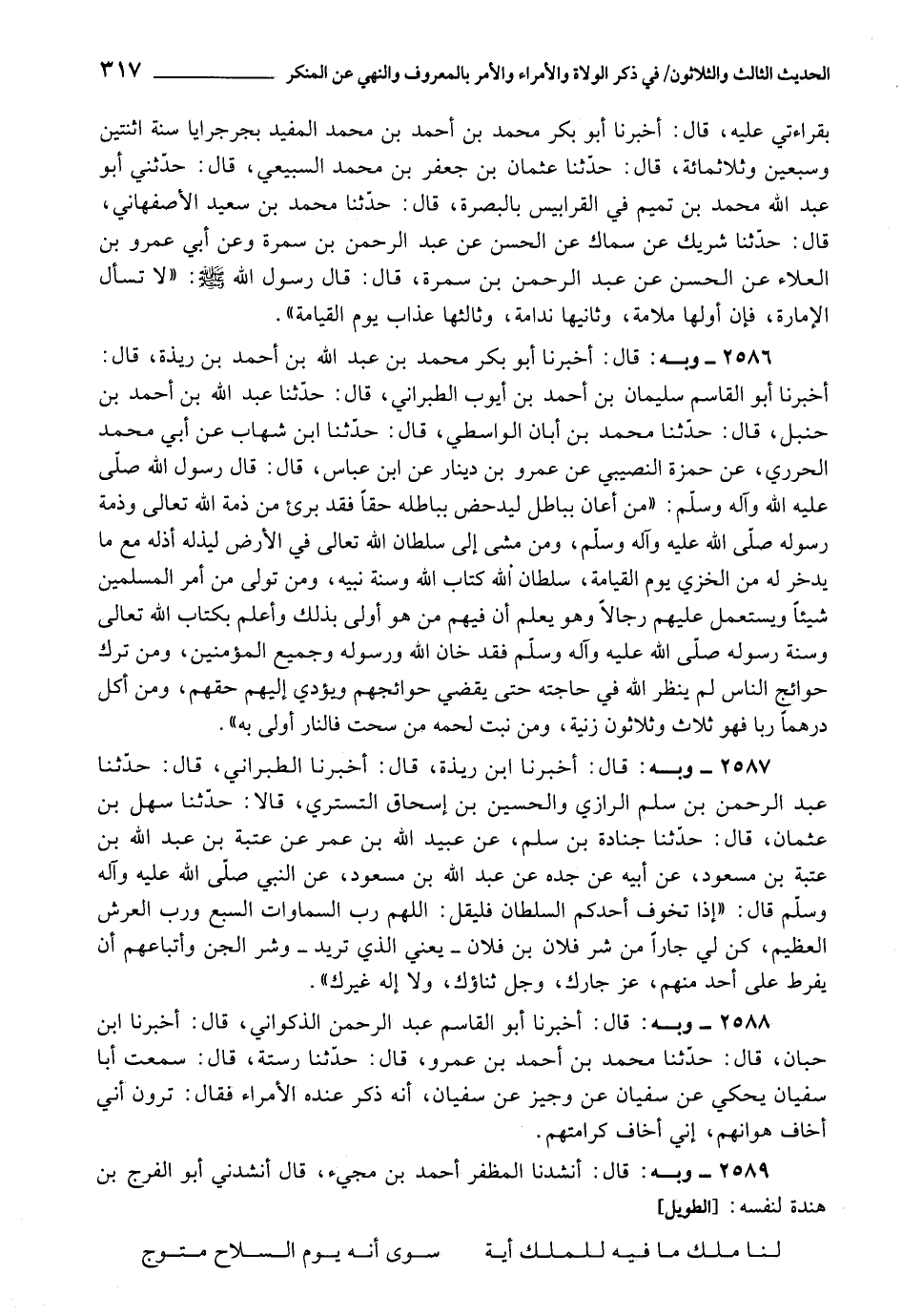 2586 - أَخْبَرَنَا أَبُو بَكْرٍ مُحَمَّدُ بْنُ عَبْدِ اللَّهِ بْنِ أَحْمَدَ بْنِ رَيْذَةَ، قَالَ: أَخْبَرَنَا أَبُو الْقَاسِمِ بْنِ أَحْمَدَ بْنِ أَيُّوبَ الطَّبَرَانِيُّ، قَالَ: حَدَّثَنَا عَبْدُ اللَّهِ بْنُ أَحْمَدَ بْنِ حَنْبَلٍ، قَالَ: حَدَّثَنَا مُحَمَّدُ بْنُ أَبَانَ الْوَاسِطِيُّ، قَالَ: حَدَّثَنَا ابْنُ شِهَابٍ، عَنْ أَبِي مُحَمَّدٍ الْحُرَرِيِّ، عَنْ حَمْزَةَ النَّصِيبِيِّ، عَنْ عَمْرِو بْنِ دِينَارٍ، عَنِ ابْنِ عَبَّاسٍ، قَالَ: قَالَ رَسُولُ اللَّهِ صَلَّى اللَّهُ عَلَيْهِ وَآلِهِ وَسَلَّمَ: «مَنْ أَعَانَ بِبَاطِلٍ لِيُدْحِضَ بِبَاطِلِهِ حَقًّا، فَقَدْ بَرِئَ مِنْ ذِمَّةِ اللَّهِ تَعَالَى، وَذِمَّةِ رَسُولِهِ صَلَّى اللَّهُ عَلَيْهِ وَآلِهِ وَسَلَّمَ، وَمَنْ مَشِيَ إِلَى سُلْطَانِ اللَّهِ تَعَالَى فِي الْأَرْضِ لِيَذِلَّهُ أَذَلَّهُ مَعَ مَا يَدَّخِرُ لَهُ مِنَ الْخِزْيِ يَوْمَ الْقِيَامَةِ، سُلْطَانُ اللَّهِ كِتَابُ اللَّهِ وَسُنَّةُ نَبِيِّهِ، وَمَنْ تَوَلَّى مِنْ أَمْرِ الْمُسْلِمِينَ شَيْئًا، وَيَسْتَعْمِلُ عَلَيْهِمْ رِجَالًا وَهُوَ يَعْلَمُ أَنَّ فِيهِمْ مَنْ هُوَ أَوْلَى بِذَلِكَ وَأَعْلَمَ بِكِتَابِ اللَّهِ تَعَالَى وَسُنَّةِ رَسُولِهِ صَلَّى اللَّهُ عَلَيْهِ وَآلِهِ وَسَلَّمَ، فَقَدْ خَانَ اللَّهَ وَرَسُولَهُ وَجَمِيعَ الْمُؤْمِنِينَ، وَمَنْ تَرَكَ حَوَائِجَ النَّاسِ لَمْ يَنْظُرِ اللَّهُ فِي حَاجَتِهِ حَتَّى يَقْضِيَ حَوَائِجَهُمْ، وَيُؤَدِّيَ إِلَيْهِمْ حَقَّهُمْ، وَمَنْ أَكَلَ دِرْهَمًا رِبًا فَهُوَ ثَلَاثٌ وَثَلَاثُونَ زَنْيَةً، وَمَنْ نَبَتَ لَحْمُهُ مِنْ سُحْتٍ , فَالنَّارُ أَوْلَى بِهِ»