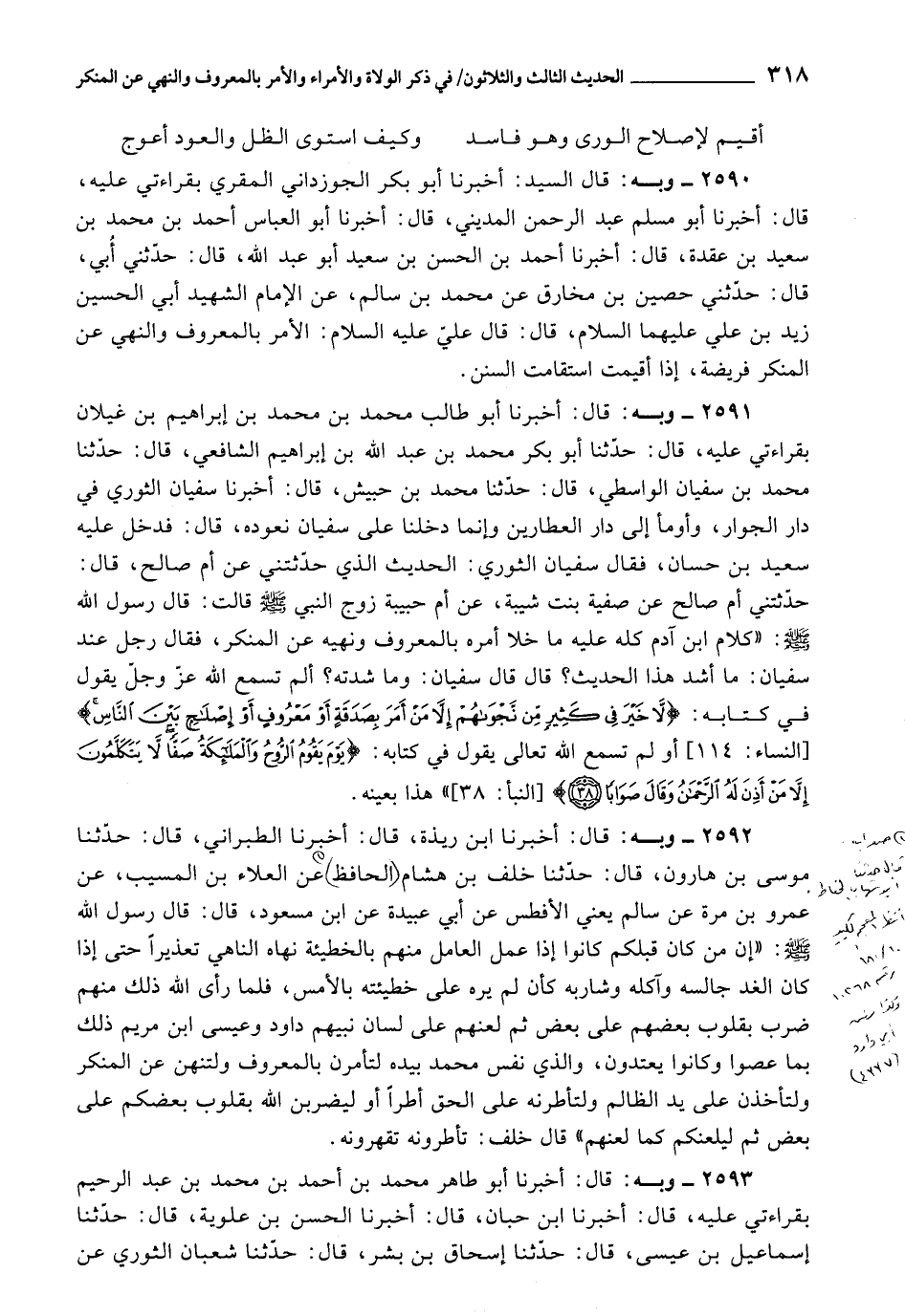 2591 - أَخْبَرَنَا أَبُو طَالِبٍ مُحَمَّدُ بْنُ مُحَمَّدِ بْنِ إِبْرَاهِيمَ بْنِ غَيْلَانَ , بِقِرَاءَتِي عَلَيْهِ، قَالَ: حَدَّثَنَا أَبُو بَكْرٍ مُحَمَّدُ بْنُ عَبْدِ اللَّهِ بْنِ إِبْرَاهِيمَ الشَّافِعِيُّ، قَالَ: حَدَّثَنَا مُحَمَّدُ بْنُ سُفْيَانَ الْوَاسِطِيُّ، قَالَ: حَدَّثَنَا مُحَمَّدُ بْنُ حُبَيْشٍ، قَالَ: أَخْبَرَنَا سُفْيَانُ الثَّوْرِيُّ , فِي دَارِ الْجُوَارِ، وَأَوْمَأَ إِلَى دَارِ الْعَطَّارِينَ , وَإِنَّمَا دَخَلْنَا عَلَى سُفْيَانَ نَعُودُهُ، قَالَ: فَدَخَلَ عَلَيْهِ سَعِيدُ بْنُ حَسَّانٍ، فَقَالَ سُفْيَانُ الثَّوْرِيُّ: الْحَدِيثُ الَّذِي حَدَّثْتَنِي عَنْ أُمِّ صَالِحٍ، قَالَ: حَدَّثَتْنِي أُمُّ صَالِحٍ، عَنْ صَفِيَّةَ بِنْتِ شَيْبَةَ، عَنْ أُمِّ حَبِيبَةَ زَوْجِ النَّبِيِّ صَلَّى اللَّهُ عَلَيْهِ وَسَلَّمَ، قَالَتْ: قَالَ رَسُولُ اللَّهِ صَلَّى اللَّهُ عَلَيْهِ وَسَلَّمَ: «كَلَامُ ابْنِ آدَمَ كُلُّهُ عَلَيْهِ , مَا خَلَا أَمْرَهُ بِالْمَعْرُوفِ , وَنَهْيَهُ عَنِ الْمُنْكَرِ» ، فَقَالَ رَجُلٌ عِنْدَ سُفْيَانَ: مَا أَشَدُّ هَذَا الْحَدِيثِ؟ قَالَ: قَالَ سُفْيَانُ: وَمَا شِدَّتُهُ؟ أَلَمْ تَسْمَعِ اللَّهَ عَزَّ وَجَلَّ يَقُولُ فِي كِتَابِهِ {يَوْمَ يَقُومُ الرُّوحُ وَالْمَلائِكَةُ صَفًّا لا يَتَكَلَّمُونَ إِلا مَنْ أَذِنَ لَهُ الرَّحْمَنُ وَقَالَ صَوَابًا} [النبأ: 38] .
