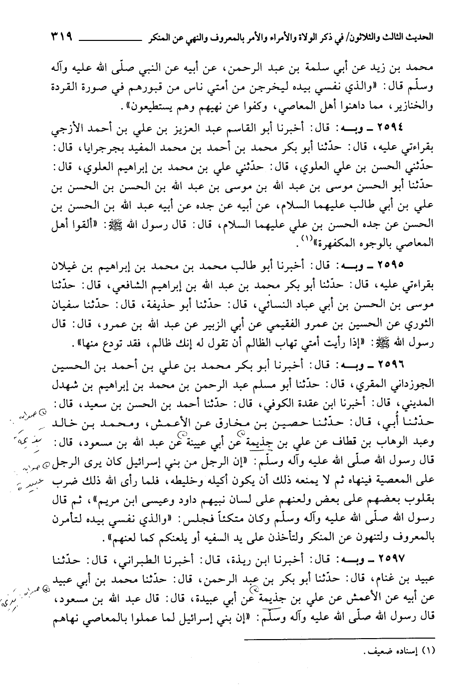 2596 - أَخْبَرَنَا أَبُو بَكْرٍ مُحَمَّدُ بْنُ عَلِيِّ بْنِ أَحْمَدَ بْنِ الْحُسَيْنِ الْجُوزْدَانِيُّ الْمُقْرِيُّ، قَالَ: حَدَّثَنَا أَبُو مُسْلِمٍ عَبْدُ الرَّحْمَنِ بْنُ مُحَمَّدِ بْنِ إِبْرَاهِيمَ بْنِ شَهْدَلٍ الْمَدِينِيُّ، قَالَ: أَخْبَرَنَا ابْنُ عُقْدَةَ الْكُوفِيُّ، قَالَ: حَدَّثَنَا أَحْمَدُ بْنُ الْحَسَنِ بْنِ سَعِيدٍ، قَالَ: حَدَّثَنَا أَبِي، قَالَ: حَدَّثَنَا حُصَيْنُ بْنُ مُخَارِقٍ، عَنِ الْأَعْمَشِ، وَمُحَمَّدِ بْنِ خَالِدٍ، وَعَبْدِ الْوَهَّابِ بْنِ قَطَافٍ، عَنْ عَلِيِّ بْنِ جُذَيْمَةَ، عَنْ أَبِي عُيَيْنَةَ، عَنْ عَبْدِ اللَّهِ بْنِ مَسْعُودٍ، قَالَ: قَالَ رَسُولُ اللَّهِ صَلَّى اللَّهُ عَلَيْهِ وَآلِهِ وَسَلَّمَ: " إِنَّ الرَّجُلَ مِنْ بَنِي إِسْرَائِيلَ كَانَ يَرَى الرَّجُلَ عَلَى الْمَعْصِيَةِ , فَيَنْهَاهُ ثُمَّ لَا يَمْنَعُهُ ذَلِكَ أَنْ يَكُونَ أَكِيلَهُ وَخَلِيطَهُ، فَلَمَّا رَأَى اللَّهُ ذَلِكَ ضَرَبَ بِقُلُوبِ بَعْضِهِمْ عَلَى بَعْضٍ , وَلَعَنَهُمْ عَلَى لِسَانِ نَبِيِّهِمْ دَاوُدَ وَعِيسَى ابْنِ مَرْيَمَ، ثُمَّ قَالَ رَسُولُ اللَّهِ صَلَّى اللَّهُ عَلَيْهِ وَآلِهِ وَسَلَّمَ وَكَانَ مُتَّكِئًا فَجَلَسَ: وَالَّذِي نَفْسِي بِيَدِهِ , لَتَأْمُرُنَّ بِالْمَعْرُوفِ، وَلَتَنْهُنَّ عَنِ الْمُنْكَرِ وَلَتَأْخُذُنَّ عَلَى يَدِ السَّفِيهِ أَوْ يَلْعَنُكُمْ كَمَا لَعَنَهُمُ "