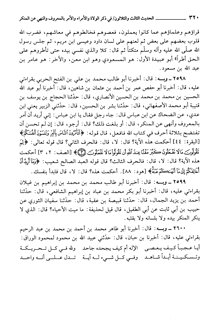 2598 - أَخْبَرَنَا أَبُو طَالِبٍ مُحَمَّدُ بْنُ عَلِيِّ بْنِ الْفَتْحِ الْحَرْبِيُّ , بِقِرَاءَتِي عَلَيْهِ، قَالَ: أَخْبَرَنَا أَبُو حَفْصٍ عُمَرُ بْنُ أَحْمَدَ بْنِ عُثْمَانَ بْنِ شَاهِينَ، قَالَ: أَخْبَرَنَا أَبُو عَبْدِ اللَّهِ الْحُسَيْنُ بْنُ مُحَمَّدِ بْنِ مُحَمَّدِ بْنِ الْحُسَيْنِ الْأَنْصَارِيُّ، قَالَ: حَدَّثَنَا الْحَجَّاجُ بْنُ يُوسُفَ بْنِ قُتَيْبَةَ أَبُو مُحَمَّدٍ الْأَصْفَهَانِيُّ، قَالَ: حَدَّثَنَا بِشْرُ بْنُ الْحُسَيْنِ، قَالَ: حَدَّثَنِي الزُّبَيْرُ يَعْنِي ابْنَ عَدِيٍّ، عَنِ الضَّحَّاكِ، عَنِ ابْنِ عَبَّاسٍ قَالَ: جَاءَ رَجُلٌ، فَقَالَ: " يَا ابْنَ عَبَّاسٍ، إِنِّي أُرِيدُ أَنْ آمُرَ بِالْمَعْرُوفِ , وَأَنْهَى عَنِ الْمُنْكَرِ، قَالَ: أَوَ بَلَغْتَ ذَلِكَ؟ قَالَ: أَرْجُو، قَالَ: إِنْ لَمْ تُحْسِنْ أَنْ تَفْتَضِحَ بِثَلَاثَةِ أَحْرُفٍ فِي كِتَابِ اللَّهِ , فَافْعَلْ، قَالَ قَوْلَهُ: {أَتَأْمُرُونَ النَّاسَ بِالْبِرِّ وَتَنْسَوْنَ أَنْفُسَكُمْ} [البقرة: 44] ، أَحَكَمَتْ هَذِهِ الْآيَةُ؟ قَالَ: لَا، قَالَ: فَالْحَرْفُ الثَّانِي؟ قَالَ قَوْلَهُ تَعَالَى: {لِمَ تَقُولُونَ مَا لا تَفْعَلُونَ {2} كَبُرَ مَقْتًا عِنْدَ اللَّهِ أَنْ تَقُولُوا مَا لا تَفْعَلُونَ} [الصف: 2-3] ، أَحَكَمَتْ هَذِهِ الْآيَةُ؟ قَالَ: لَا، قَالَ: فَالْحَرْفُ الثَّالِثُ قَالَ قَوْلَهُ تَعَالَى: {وَمَا أُرِيدُ أَنْ أُخَالِفَكُمْ إِلَى مَا أَنْهَاكُمْ عَنْهُ} [هود: 88] .