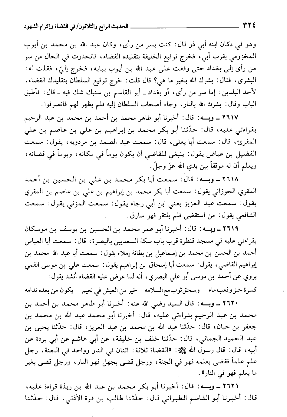 2617 - أَخْبَرَنَا أَبُو طَاهِرٍ مُحَمَّدُ بْنُ أَحْمَدَ بْنِ مُحَمَّدِ بْنِ عَبْدِ الرَّحِيمِ , بِقِرَاءَتِي عَلَيْهِ، قَالَ: حَدَّثَنَا أَبُو بَكْرٍ مُحَمَّدُ بْنُ إِبْرَاهِيمَ بْنِ عَلِيِّ بْنِ عَاصِمِ بْنِ عَلِيٍّ الْمُقْرِئُ، قَالَ: سَمِعْتُ أَبَا يَعْلَى، قَالَ: سَمِعْتُ عَبْدَ الصَّمَدِ بْنَ مَرْدَوَيْهِ، يَقُولُ: سَمِعْتُ الْفُضَيْلَ بْنَ عِيَاضٍ يَقُولُ: يَنْبَغِي لِلْقَاضِي أَنْ يَكُونَ يَوْمًا فِي مَكَانِهِ، وَيَوْمًا فِي مَكَانِ قَضَائِهِ , وَيَعْلَمَ أَنَّ لَهُ مَوْقِفًا بَيْنَ يَدَيِ اللَّهِ عَزَّ وَجَلَّ.