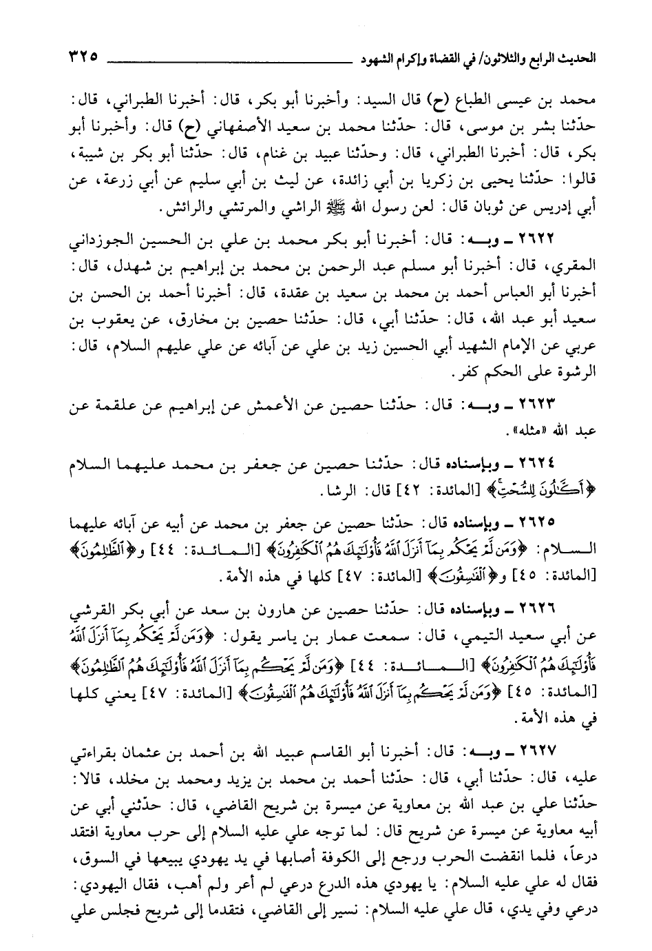 2625 - حَدَّثَنَا حُصَيْنٌ، عَنْ جَعْفَرِ بْنِ مُحَمَّدٍ، عَنْ أَبِيهِ، عَنْ آبَائِهِ عَلَيْهِمَا السَّلَامُ: {وَمَنْ لَمْ يَحْكُمْ بِمَا أَنْزَلَ اللَّهُ فَأُولَئِكَ هُمُ الْكَافِرُونَ} [المائدة: 44] وَ {الظَّالِمُونَ} [المائدة: 45] وَ {الْفَاسِقُونَ} [المائدة: 47] ، كُلُّهَا فِي هَذِهِ الْأُمَّةِ.