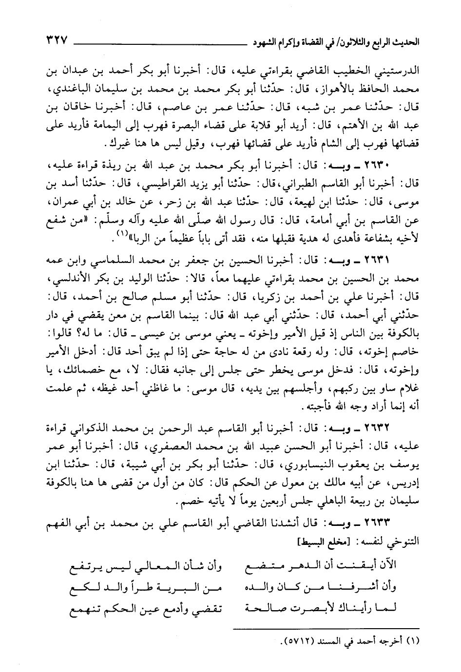 2631 - أَخْبَرَنَا الْحُسَيْنُ بْنُ جَعْفَرِ بْنِ مُحَمَّدٍ السَّلَمَاسِيُّ، وَابْنُ عَمِّهِ مُحَمَّدُ بْنُ الْحُسَيْنِ بْنِ مُحَمَّدٍ , بِقِرَاءَتِي عَلَيْهِمَا مَعًا، قَالَا: حَدَّثَنَا الْوَلِيدُ بْنُ بَكْرٍ الْأَنْدَلُسِيُّ، قَالَ: أَخْبَرَنَا عَلِيُّ بْنُ أَحْمَدَ بْنِ زَكَرِيَّا، قَالَ: حَدَّثَنَا أَبُو مُسْلِمٍ صَالِحُ بْنُ أَحْمَدَ، قَالَ: حَدَّثَنِي أَبِي أَحْمَدُ، قَالَ: حَدَّثَنِي أَبِي عَبْدِ اللَّهِ قَالَ: بَيْنَمَا الْقَاسِمُ بْنُ مَعْنٍ يَقْضِي فِي دَارٍ بِالْكُوفَةِ بَيْنَ النَّاسِ إِذْ قِيلَ: الْأَمِيرُ وَإِخْوَتُهُ يَعْنِي مُوسَى بْنَ عِيسَى , قَالَ: مَا لَهُ؟ قَالُوا: خَاصَمَ إِخْوَتَهُ، قَالَ: وَلَهُ رُقْعَةٌ نَادَى مَنْ لَهُ حَاجَةٌ , حَتَّى إِذَا لَمْ يَبْقَ أَحَدٌ , قَالَ: أَدْخِلِ الْأَمِيرَ وَإِخْوَتَهُ قَالَ: فَدَخَلَ مُوسَى يُخْطِرُ , حَتَّى جَلَسَ إِلَى جَانِبِهِ , فَقَالَ لَا، مَعَ خُصَمَائِكَ، يَا غُلَامُ سَاوِ بَيْنَ رَكْبِهِمْ، وَأَجْلِسْهُمْ بَيْنَ يَدَيْهِ، قَالَ مُوسَى: مَا غَاظَنِي أَحَدٌ غَيْظَهُ، ثُمَّ عَلِمْتُ أَنَّهُ إِنَّمَا أَرَادَ وَجْهَ اللَّهِ , فَأَجَبْتُهُ.
