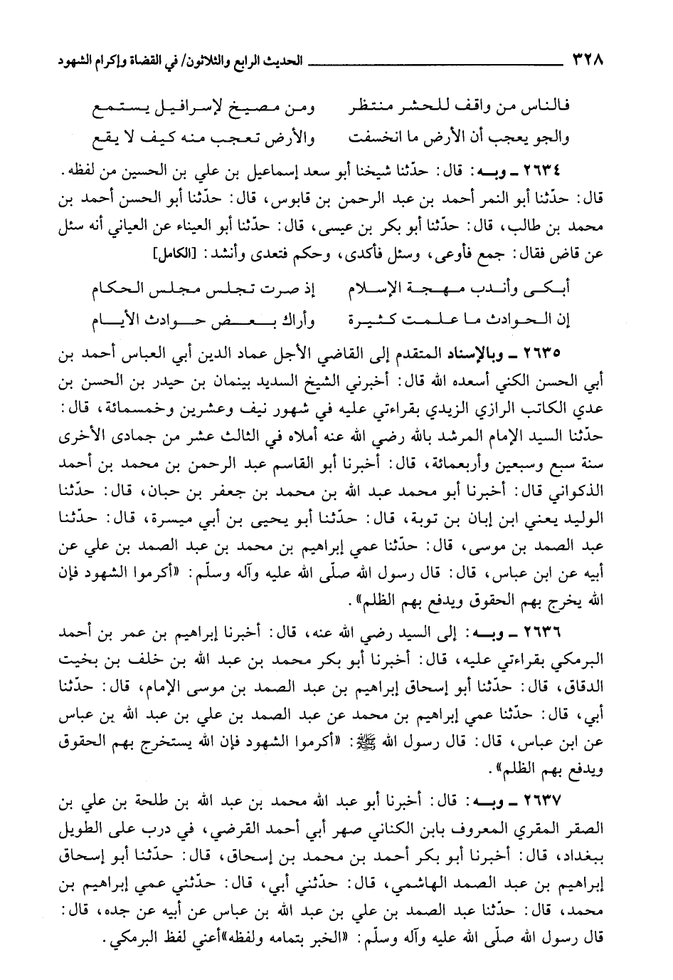 2636 - أَخْبَرَنَا إِبْرَاهِيمُ بْنُ عُمَرَ بْنِ أَحْمَدَ الْبَرْمَكِيُّ , بِقِرَاءَتِي عَلَيْهِ، قَالَ: أَخْبَرَنَا أَبُو بَكْرٍ مُحَمَّدُ بْنُ عَبْدِ اللَّهِ بْنِ خَلَفِ بْنِ بَخِيتٍ الدَّقَّاقُ، قَالَ: حَدَّثَنَا أَبُو إِسْحَاقَ إِبْرَاهِيمُ بْنُ عَبْدِ الصَّمَدِ بْنُ مُوسَى الْإِمَامُ، قَالَ: حَدَّثَنَا أَبِي، قَالَ: حَدَّثَنَا عَمِّي إِبْرَاهِيمُ بْنُ مُحَمَّدٍ، عَنْ عَبْدِ الصَّمَدِ بْنِ عَلِيِّ بْنِ عَبْدِ اللَّهِ بْنِ عَبَّاسٍ، عَنِ ابْنِ عَبَّاسٍ، قَالَ: قَالَ رَسُولُ اللَّهِ صَلَّى اللَّهُ عَلَيْهِ وَسَلَّمَ: «أَكْرِمُوا الشُّهُودَ , فَإِنَّ اللَّهَ يَسْتَخْرِجُ بِهِمُ الْحُقُوقَ، وَيَدْفَعُ بِهِمُ الظُّلْمَ» .