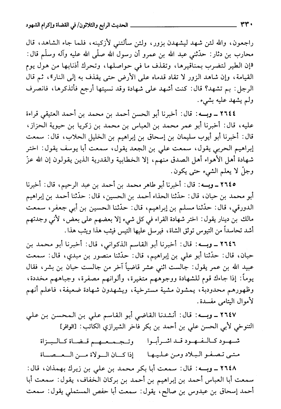 2646 - أَخْبَرَنَا أَبُو الْقَاسِمِ الذَّكْوَانِيُّ، قَالَ: أَخْبَرَنَا أَبُو مُحَمَّدِ بْنُ حِبَّانَ، قَالَ: حَدَّثَنَا أَبُو عَلِيِّ بْنُ إِبْرَاهِيمَ، قَالَ: حَدَّثَنَا مَنْصُورُ بْنُ مُبْدِيٍّ، قَالَ: سَمِعْتُ عُبَيْدَ اللَّهِ بْنَ عُمَرَ يَقُولُ: جَالَسْتُ اثْنَيْ عَشَرَ قَاضِيًا آخِرُ مَنْ جَالَسْتُ حِبَّانَ بْنَ بِشْرٍ، فقَالَ يَوْمًا: إِذَا جَاءَكَ قَوْمٌ لِلشَّهَادَةِ وَوُجُوهُمُ مُتَغَيِّرَةٌ، وَأَلْوَانُهُمْ مُصْفَرَّةً، وَجِبَاهُهُمْ مُخَدَّدَةٌ، وَظُهُورُهُمْ مَحدوبَةٌ، يَمْشُونَ مِشْيَةً مُسْتَرْخِيَةً، وَيَشْهَدُونَ شَهَادَةً ضَعِيفَةً، فَاعْلَمْ أَنَّهُمْ لِأَمْوَالِ الْيَتَامَى مَفْسَدَةٌ.