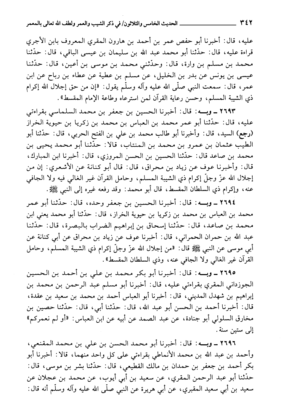 عَلَيْهِ، قَالَ: أَخْبَرَنَا أَبُو حَفْصٍ عُمَرُ بْنُ أَحْمَدَ بْنِ هَارُونَ الْمُقْرِيُّ الْمَعْرُوفُ بِابْنِ الْآجِرِيِّ قِرَاءَةً عَلَيْهِ، قَالَ: حَدَّثَنَا أَبُو مُحَمَّدٍ عَبْدُ اللَّهِ بْنُ سُلَيْمَانَ بْنِ عِيسَى الْبَاقِي، قَالَ: حَدَّثَنَا مُحَمَّدُ بْنُ مُسْلِمِ بْنِ وَارَةَ، قَالَ: وَحَدَّثَنِي مُحَمَّدُ بْنُ مُوسَى بْنِ أَعْيَنَ، وَقَالَ حَدَّثَنَا عِيسَى بْنُ يُونُسَ، عَنْ بَدْرٍ الْخَلِيلِ، عَنْ مُسْلِمِ بْنِ عَطِيَّةَ، عَنْ عَطَاءِ بْنِ رَبَاحٍ، عَنِ ابْنِ عُمَرَ، قَالَ: سَمِعْتُ النَّبِيَّ صَلَّى اللَّهُ عَلَيْهِ وَآلِهِ وَسَلَّمَ يَقُولُ: «إِنَّ مِنْ حَقِّ إِجْلَالِ اللَّهِ إِكْرَامِ ذِي الشَّيْبَةِ الْمُسْلِمِ، وَحُسْنِ رِعَايَةِ الْقُرْآنِ لِمَنِ اسْتَرْعَاهُ , وَطَاعَةُ الْإِمَامِ الْمُقْسِطِ»