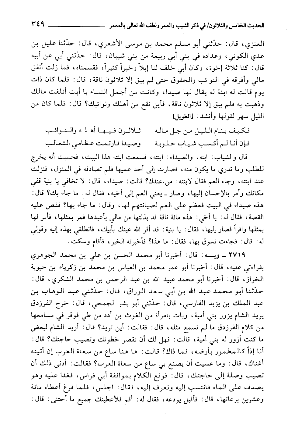 2719 - أَخْبَرَنَا أَبُو مُحَمَّدٍ الْحَسَنُ بْنُ عَلِيِّ بْنِ مُحَمَّدٍ الْجَوْهَرِيُّ , بِقِرَاءَتِي عَلَيْهِ، قَالَ: أَخْبَرَنَا أَبُو عُمَرَ مُحَمَّدُ بْنُ الْعَبَّاسِ بْنِ مُحَمَّدِ بْنِ زَكَرِيَّاءَ بْنِ حَيَوَيْهِ الْخَرَّازُ، قَالَ: أَخْبَرَنَا أَبُو مُحَمَّدٍ عُبَيْدُ اللَّهِ بْنُ عَبْدِ الرَّحْمَنِ بْنِ مُحَمَّدٍ الشُّكْرِيُّ، قَالَ: حَدَّثَنَا أَبُو مُحَمَّدٍ عَبْدُ اللَّهِ بْنُ أَبِي سَعْدٍ الْوَرَّاقُ، قَالَ: حَدَّثَنِي عَبْدُ الْوَهَّابِ بْنُ عَبْدِ الْمَلِكِ بْنِ يَزِيدَ الْفَارِسِيُّ، قَالَ: حَدَّثَنِي أَبُو بِشْرٍ الْجُمَحِيُّ، قَالَ: خَرَجَ الْفَرَزْدَقُ يُرِيدُ الشَّامَ يَزُورُ بَني أُمَيَّةَ، وَبَاتَ بِامْرَأَةٍ مِنَ الْغَوْثِ بْنِ أَدَدَ مِنْ طَيِّءَ , فَوَقَرَ فِي مَسَامِعِهَا مِنْ كَلَامِ الْفَرَزْدَقِ مَا لَمْ تَسْمَعْ مِثْلَهُ، قَالَ: فَقَالَتْ: أَيْنَ تُرِيدُ؟ قَالَ: أُرِيدُ الشَّامَ لِبَعْضِ مَا كُنْتُ أَزُورُ لَهُ بَنِي أُمَيَّةَ، قَالَتْ: فَهَلْ لَكَ أَنْ تُقَصِّرَ خَطْوَتَكَ وَتُصِيبَ حَاجَتَكَ؟ قَالَ: أَنَا إِذًا كَالْمَطْمُورِ بِأَرْضِهِ، فَمَا ذَاكَ؟ قَالَتْ: هَا هُنَا سَاعٍ مِنْ سُعَاةِ الْعَرَبِ إِنْ أَتَيْتَهُ أَغْنَاكَ، قَالَ: وَمَا عَسِيتُ أَنْ يَصْنَعَ بِي سَاعٍ مِنْ سُعَاةِ الْعَرَبِ؟ فَقَالَتْ: أَدْنَى ذَلِكَ أَنْ تُصِيبَ وَصْلَةً إلى حاجتك، قَالَ: فَوَقَعَ الْكَلَامُ بِمُوَافَقَةِ أَبِي فِرَاسٍ، فَغَدَا عَلَيْهِ , وَهُوَ يَصْدِفُ عَلَى الْمَاءِ , فَانْتَسَبَ إِلَيْهِ , وَتَعَرَّفَ إِلَيْهِ، فَقَالَ: اجْلِسْ، فَلَمَّا فَرَغَ , أَعْطَاهُ مِائَةً وَعِشْرِينَ بِرَعَاتِهَا، قَالَ: فَأْقبَلَ يُوَدِّعُهُ، فَقَالَ لَهُ: قُمْ , فَلَأُعْطِيَّنَّكَ جَمِيعَ مَا أَحْتَنِي قَالَ: