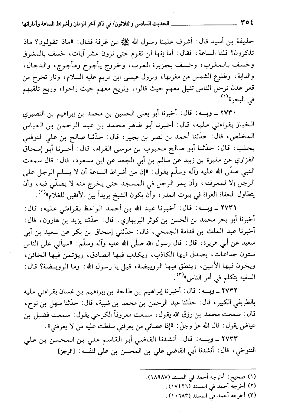2730 - أَخْبَرَنَا أَبُو يَعْلَى الْحُسَيْنُ بْنُ مُحَمَّدِ بْنِ إِبْرَاهِيمَ النُّصَيْرِيُّ الْخَبَّازُ , بِقِرَاءَتِي عَلَيْهِ، قَالَ: أَخْبَرَنَا أَبُو طَاهِرٍ مُحَمَّدُ بْنُ عَبْدِ الرَّحْمَنِ بْنِ الْعَبَّاسِ الْمُخْلِصُ، قَالَ: حَدَّثَنَا أَحْمَدُ بْنُ نَصْرِ بْنِ بُجَيْرٍ، قَالَ: حَدَّثَنَا صَالِحُ بْنُ عَلِيٍّ النَّوْفَلِيُّ , بِحَلَبَ، قَالَ: حَدَّثَنَا أَبُو صَالِحٍ مَحْبُوبُ بْنُ مُوسَى الْفَرَّاءُ، قَالَ: أَخْبَرَنَا أَبُو إِسْحَاقَ الْفَزَارِيُّ، عَنْ مُغِيرَةَ بْنِ زَبِيدٍ، عَنْ سَالِمِ بْنِ أَبِي الْجَعْدِ، عَنِ ابْنِ مَسْعُودٍ، قَالَ: قَالَ: سَمِعْتُ النَّبِيَّ صَلَّى اللَّهُ عَلَيْهِ وَآلِهِ وَسَلَّمَ يَقُولُ: إِنَّ مِنْ أَشْرَاطِ السَّاعَةِ أَنْ لَا يُسَلِّمَ الرَّجُلُ عَلَى الرَّجُلِ , إِلَّا لِمَعْرِفَتِهِ، وَأَنْ يَمُرَّ الرَّجُلُ فِي الْمَسْجِدِ حَتَّى يَخْرُجَ مِنْهُ لَا يُصَلِّى فِيهِ، وَأَنْ يتَطَاوَلَ الْحُفَاةُ العُرَاةُ فِي بُيُوتِ الْمَدَرِ، وَأَنْ يَكُونَ الشَّيْخُ بَرِيدًا بَيْنَ الْأُفُقَيْنِ لِلْغُلَامِ "