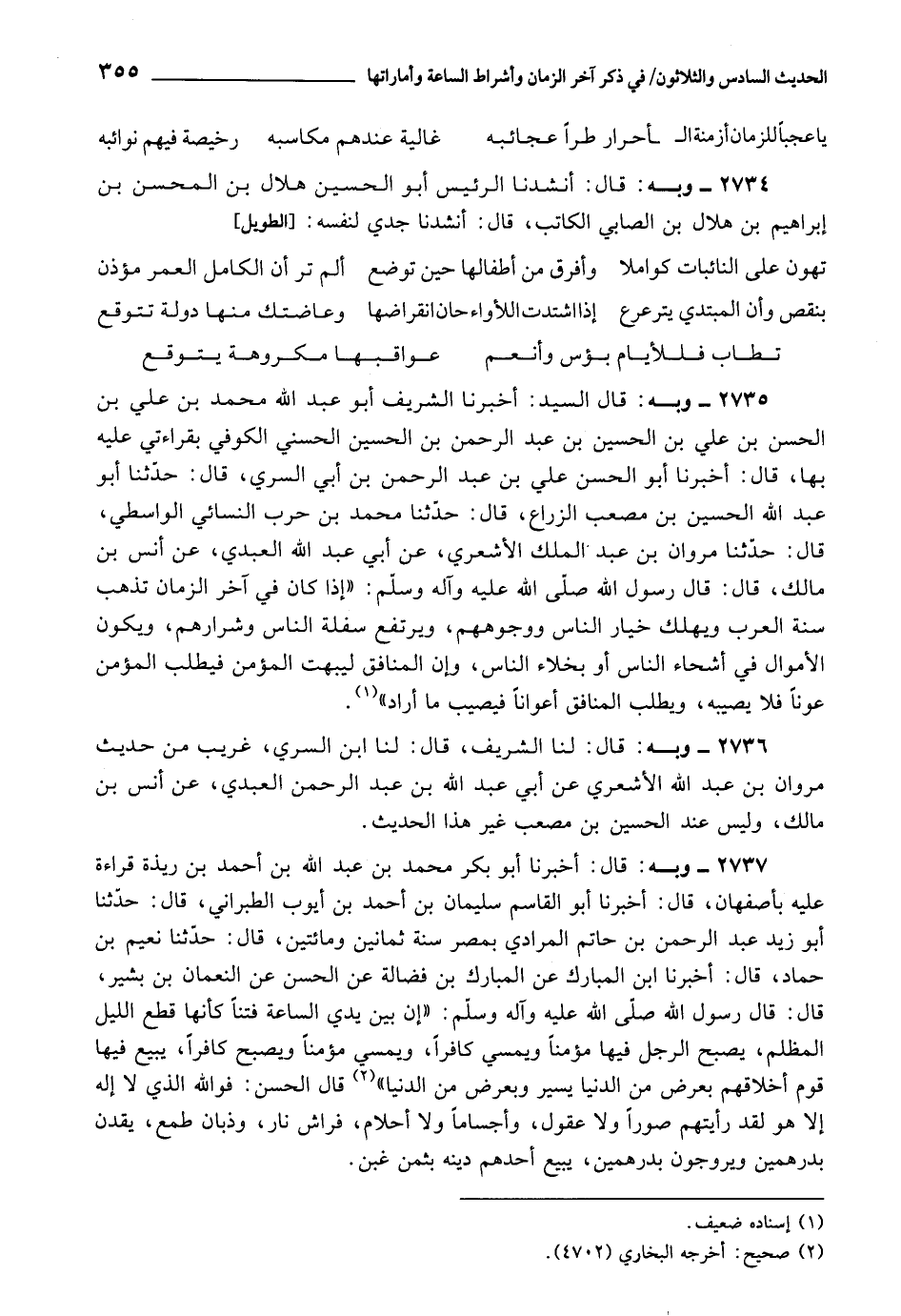2735 - أَخْبَرَنَا الشَّرِيفُ أَبُو عَبْدِ اللَّهِ مُحَمَّدُ بْنُ عَلِيِّ بْنِ الْحَسَنِ بْنِ عَلِيِّ بْنِ الْحُسَيْنِ بْنِ عَبْدِ الرَّحْمَنِ بْنِ الْحُسَيْنِ الْحَسَنِيُّ الْكُوفِيُّ , بِقِرَاءَتِي عَلَيْهِ بِهَا، قَالَ: أَخْبَرَنَا أَبُو الْحَسَنِ عَلِيُّ بْنُ عَبْدِ الرَّحْمَنِ بْنِ أَبِي السَّرِيِّ، قَالَ: حَدَّثَنَا أَبُو عَبْدِ اللَّهِ الْحُسَيْنُ بْنُ الْحُسَيْنِ بْنِ مُصْعَبٍ الزَّرَّاعُ، قَالَ: حَدَّثَنَا مُحَمَّدُ بْنُ حَرْبٍ النَّسَائِيُّ الْوَاسِطِيُّ، قَالَ: حَدَّثَنَا مَرْوَانُ بْنُ عَبْدِ الْمَلِكِ الْأَشْعَرِيُّ، عَنْ أَبِي عَبْدِ اللَّهِ الْعَبْدِيُّ، عَنْ أَنَسِ بْنِ مَالِكٍ، قَالَ: قَالَ رَسُولُ اللَّهِ صَلَّى اللَّهُ عَلَيْهِ وَآلِهِ وَسَلَّمَ: «إِذَا كَانَ فِي آخِرِ الزَّمَان تَذْهَبُ سُنَّةُ الْعَرَبِ، وَيَهْلِكُ خِيَارُ النَّاسِ وَوُجُوهُمْ، وَيَرْتَفِعُ سَفَلَةُ النَّاسِ , وَشِرَارُهُمْ، وَتَكُونُ الْأَمْوُالِ فِي أَشِحَّاءِ النَّاسِ , أَوْ بُخَلَاءِ النَّاسِ، وَإِنَّ الْمُنَافِقَ لَيَبْهَتُ الْمُؤْمِنَ , فَيَطْلُبُ الْمُؤْمِنُ عَوْنًا , فَلَا يُصِيبُهُ، وَيَطْلُبُ الْمُنَافِقُ أَعْوَانًا فَيُصِيبُ مَا أَرَادَ» .