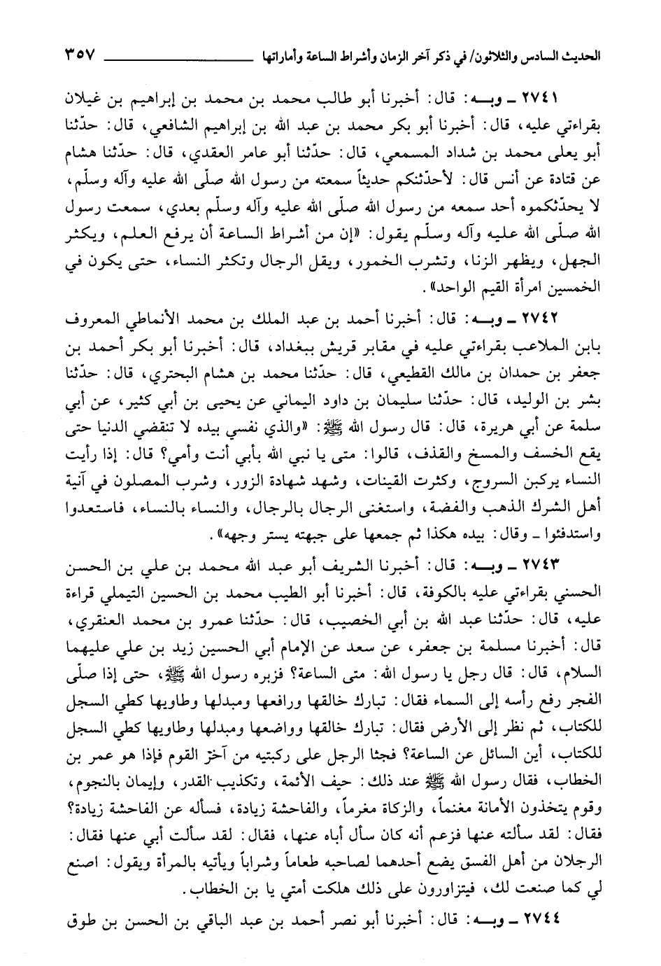 2743 - أَخْبَرَنَا الشَّرِيفُ أَبُو عَبْدِ اللَّهِ مُحَمَّدُ بْنُ عَلِيِّ بْنِ الْحَسَنِ الْحَسَنِيُّ، بِقِرَاءَتِي عَلَيْهِ بِالْكُوفَةِ، قَالَ: أَخْبَرَنَا أَبُو الطَّيِّبِ مُحَمَّدُ بْنُ الْحُسَيْنِ التَّيْمَلِيُّ، قِرَاءَةً عَلَيْهِ، قَالَ: حَدَّثَنَا عَبْدُ اللَّهِ بْنُ أَبِي الْخَصِيبِ، قَالَ: حَدَّثَنَا عَمْرُو بْنُ مُحَمَّدٍ الْعَنْقَرِيُّ، قَالَ: أَخْبَرَنَا مَسْلَمَةُ بْنُ جَعْفَرٍ، عَنْ سَعْدٍ، عَنِ الْإِمَامِ أَبِي الْحُسَيْنِ زَيْدِ بْنِ عَلِيٍّ عَلَيْهِمَا السَّلَامُ، قَالَ: قَالَ رَجُلٌ: يَا رَسُولَ اللَّهِ، مَتَى السَّاعَةُ؟ فَزَبَرَهُ رَسُولُ اللَّهِ صَلَّى اللَّهُ عَلَيْهِ وَسَلَّمَ , حَتَّى إِذَا صَلَّى الْفَجْرَ " رَفَعَ رَأْسَهُ إِلَى السَّمَاءِ فَقَالَ: تَبَارَكَ خَالِقُهَا , وَرَافِعُهَا , وَمُبْدِلُهَا , وَطَاوِيهَا كَطِيِّ السِّجِلِّ لِلْكِتَابِ، ثُمَّ نَظَرَ إِلَى الْأَرْضِ فَقَالَ: تَبَارَكَ خَالِقُهَا , وَوَاضِعُهَا , وَمُبْدِلُهَا , وَطَاوِيهَا كَطَيِّ السِّجِلِّ لِلْكِتَابِ، أَيْنَ السَّائِلُ عَنِ السَّاعَةِ؟ فَجَثَا الرَّجُلُ عَلَى رُكْبَتَيْهِ مِنْ آخِرِ الْقَوْمِ , فَإِذَا هُوَ عُمَرُ بْنُ الْخَطَّابِ، فَقَالَ رَسُولُ اللَّهِ صَلَّى اللَّهُ عَلَيْهِ وَسَلَّمَ عِنْدَ ذَلِكَ: حَيْفُ الْأَئِمَّةِ، وَتَكْذِيبُ الْقَدَرِ، وَإِيمَانٌ بِالنُّجُومِ، وَقَوْمٌ يَتَّخِذُونَ الْأَمَانَةَ مَغْنَمًا، وَالزَّكَاةَ مَغْرَمًا، وَالْفَاحِشَةَ زِيَادَةً "، فَسَأَلَهُ عَنِ الْفَاحِشَةِ زِيَادَةً؟ فَقَالَ: لقَدْ سَأَلْتُهُ عَنْهُا , فَزَعِمَ أَنَّهُ كَانَ سَأَلَ أَبَاهُ عَنْهَا، فَقَالَ: لَقَدْ سَأَلْتُ أَبِي عَنْهَا فَقَالَ: الرَّجُلَانِ مِنْ أَهْلِ الْفِسْقِ يَضَعُ أَحَدُهُمَا لِصَاحِبِهِ طَعَامًا وَشَرَابًا وَيَأْتِيهِ بِالْمَرْأَةِ , وَيَقُولُ: اصْنَعْ لِي كَمَا صَنَعْتُ لَكَ، فَيَتَزَاوَرُونَ عَلَى ذَلِكَ هَلَكَتْ أُمَّتِي يَا بْنَ الْخَطَّابِ