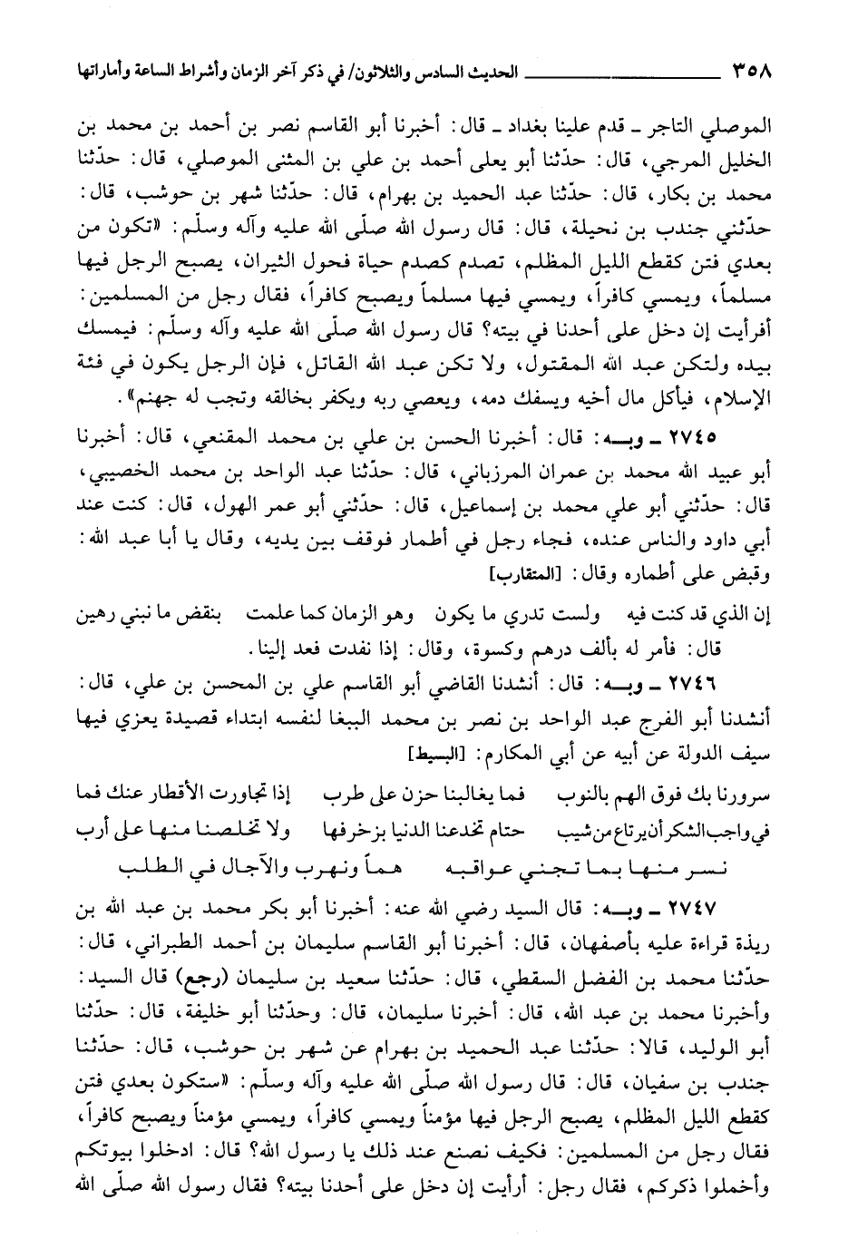 الَمَوْصِلِيُّ التَّاجِرُ , قَدِمَ عَلَيْنَا بِبَغْدَادَ , قَالَ: أَخْبَرَنَا أَبُو الْقَاسِمِ نَصْرُ بْنُ أَحْمَدَ بْنِ مُحَمَّدِ بْنِ الْخَلِيلِ الْمَرْجِيُّ، قَالَ: حَدَّثَنَا أَبُو يَعْلَى أَحْمَدُ بْنُ عَلِيِّ بْنِ الْمُثَنَّى الْمَوْصِلِيُّ، قَالَ: حَدَّثَنَا مُحَمَّدُ بْنُ بَكَّارٍ، قَالَ: حَدَّثَنَا عَبْدُ الْحَمِيدِ بْنُ بِهْرَامٍ، قَالَ: حَدَّثَنَا شَهْرُ بْنُ حَوْشَبٍ، قَالَ: حَدَّثَنِي جُنْدُبُ بْنُ بُجَيْلَةَ، قَالَ: قَالَ رَسُولُ اللَّهِ صَلَّى اللَّهُ عَلَيْهِ وَآلِهِ وَسَلَّمَ: " تَكُونُ مِنْ بَعْدِي فِتَنٌ كَقِطَعِ اللَّيْلِ الْمُظْلِمِ، تَصْدِمُ كَصَدْمِ حَيَاةِ فُحُولِ الثِّيرَانِ، يُصْبِحُ الرَّجُلُ فِيهَا مُسْلِمَا , وَيُمْسِي كَافِرًا، وَيُمْسِي فِيهَا مُسْلِمًا , وَيُصْبِحُ كَافِرًا، فَقَالَ رَجُلٌ مِنَ الْمُسْلِمِينَ: أَفَرَأَيْتَ إِنْ دَخَلَ عَلَى أَحَدِنَا فِي بَيْتِهِ؟ قَالَ رَسُولُ اللَّهِ صَلَّى اللَّهُ عَلَيْهِ وَآلِهِ وَسَلَّمَ: فَيَمْسِكُ بِيَدِهِ , وَلْتَكُنْ عَبْدَ اللَّهِ الْمَقْتُولَ، وَلَا تَكُنْ عَبْدَ اللَّهِ الْقَاتِلَ، فَإِنَّ الرَّجُلَ يَكُونُ فِي فِئَةِ الْإِسْلَامِ، فَيَأْكُلُ مَالَ أَخِيهِ , وَيَسْفِكُ دَمَهُ، وَيَعْصِي رَبَّهُ وَيَكْفُرُ بِخَالِقِهِ , وَتَجِبُ لَهُ جَهَنَّمُ "