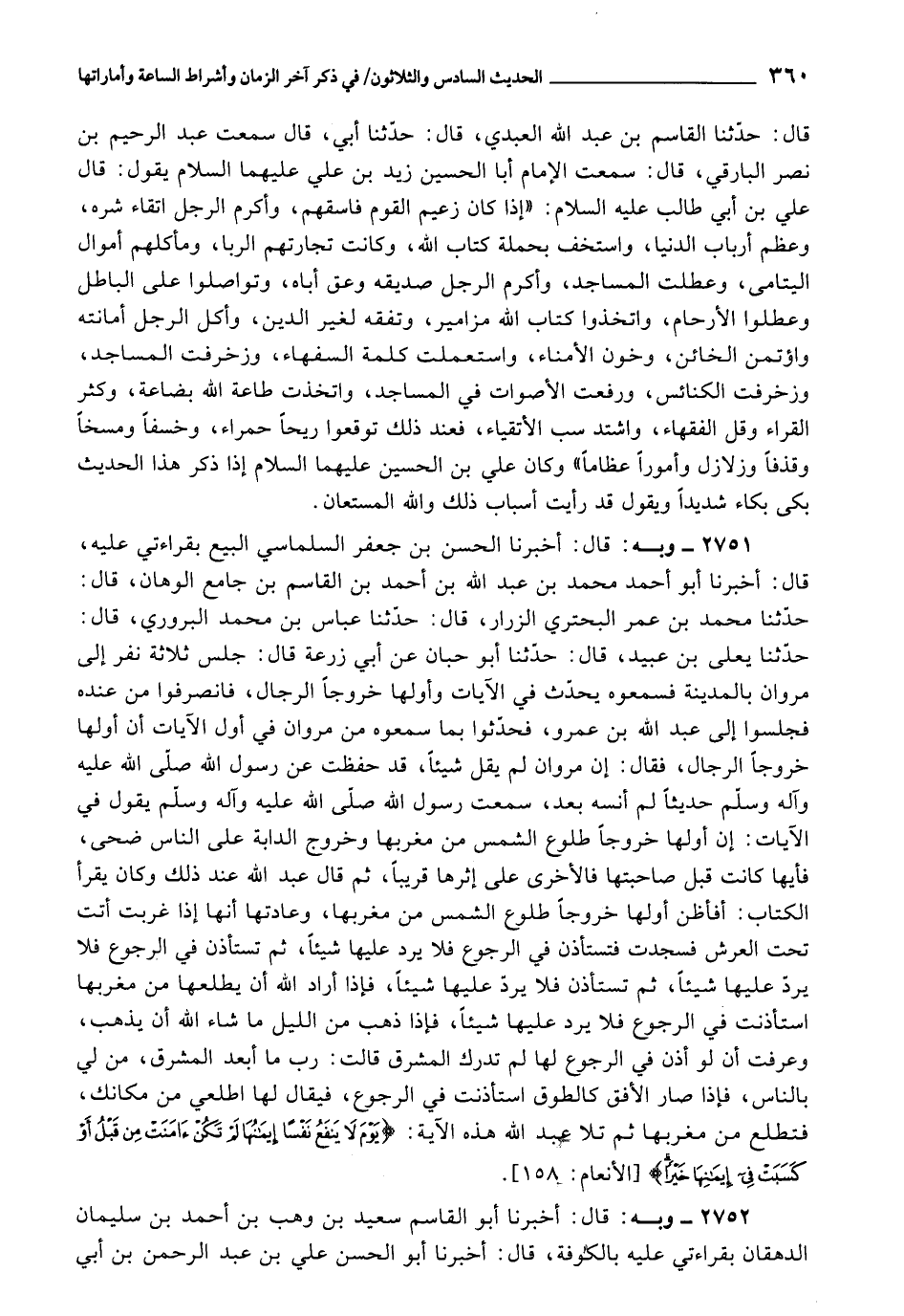 2751 - أَخْبَرَنَا الْحَسَنُ بْنُ جَعْفَرٍ السَّلْمَاسِيَّ الْبَيِّعُ , بِقِرَاءَتِي عَلَيْهِ، قَالَ: أَخْبَرَنَا أَبُو أَحْمَدَ مُحَمَّدُ بْنُ عَبْدِ اللَّهِ بْنِ أَحْمَدَ بْنِ الْقَاسِمِ بْنِ جَامِعٍ الْوَهَّانُ، قَالَ: حَدَّثَنَا مُحَمَّدُ بْنُ عُمَرَ الْبُحْتُرِيُّ الزَّرَّارُ، قَالَ: حَدَّثَنَا عَبَّاسُ بْنُ مُحَمَّدٍ الْبُرُورِيُّ، قَالَ: حَدَّثَنَا يَعْلَى بْنُ عُبَيْدٍ، قَالَ: حَدَّثَنَا أَبُو حِبَّانَ , عَنْ أَبِي زُرْعَةَ، قَالَ: جَلَسَ ثَلَاثَةُ نَفَرٍ إِلَى مَرْوَانَ بِالْمَدِينَةِ فَسَمِعُوهُ يُحَدِّثُ فِي الْآيَاتِ , وَأَوَّلُهَا خُرُوجًا الدَّجَّالُ، فَانْصَرَفُوا مِنْ عِنْدَهُ , فَجَلَسُوا إِلَى عَبْدِ اللَّهِ بْنِ عَمْرٍو، فَحَدَّثُوا بِمَا سَمِعُوهُ مِنْ مَرْوَانَ فِي أَوَّلِ الْآيَاتِ أَنَّ أَوَّلَهَا خُرُوجًا الدَّجَّالُ، فَقَالَ: إِنَّ مَرْوَانَ لَمْ يَقُلْ شَيْئًا، قَدْ حَفِظْتُ عَنْ رَسُولِ اللَّهِ صَلَّى اللَّهُ عَلَيْهِ وَآلِهِ وَسَلَّمَ حَدِيثًا لَمْ آنَسْهُ بَعْدُ، سَمِعْتُ رَسُولَ اللَّهِ صَلَّى اللَّهُ عَلَيْهِ وَآلِهِ وَسَلَّمَ يَقُولُ فِي الْآيَاتِ: «إِنَّ أَوَّلَهَا خُرُوجًا طُلُوعُ الشَّمْسِ مِنْ مَغْرِبِهَا، وَخُرُوجُ الدَّابَّةِ عَلَى النَّاسِ ضُحًى، فَأَيُّهَا كَانَتْ قَبْلَ صَاحِبَتِهَا , فَالْأُخْرَى عَلَى إِثْرِهَا قَرِيبًا» ، ثُمَّ قَالَ: عَبْدُ اللَّهِ عِنْدَ ذَلِكَ وَكَانَ يَقْرَأُ الْكِتَابَ: أَفَأَظُنُّ أَوَّلَهَا خُرُوجًا طُلُوعَ الشَّمْسِ مِنْ مَغْرِبِهَا، وَعَادَتُهُ أَنَّهَا إِذَا غَرَبَتِ الشَّمْسُ أَتَتْ تَحْتَ الْعَرْشِ فَسَجَدَتْ فَتَسْتَأْذِنُ فِي الرُّجُوعِ فَلَا يَرُدُّ عَلَيْهِا شَيْئًا، ثُمَّ تَسْتَأْذِنُ فِي الرُّجُوعِ فَلَا يَرُدُّ عَلَيْهِا شَيْئًا، ثُمَّ تَسْتَأْذِنُ فَلَا يَرُدُّ عَلَيْهِا شَيْئًا، فَإِذَا أَرَادَ اللَّهُ أَنْ يُطْلِعَهَا مِنْ مَغْرِبِهَا اسْتَأْذَنَتْ فِي الرُّجُوعِ فَلَا يَرُدُّ عَلَيْهِا شَيْئًا، فَإِذَا ذَهَبَ مِنَ اللَّيْلِ مَا شَاءَ اللَّهُ أَنْ يَذْهَبَ، وَعَرفَتْ لَوْ أَنْ أُذِنَ فِي الرُّجُوعِ لَهَا لَمْ تُدْرِكِ الْمَشْرِقَ قَالَتْ: رَبِّ مَا أَبَعَدُ الْمَشْرِقِ؟ مَنْ لِي بِالنَّاسِ؟ ، فَإِذَا صَارَ الْأُفُقُ كَالطَّوْقِ اسْتَأْذَنَتْ فِي الرُّجُوعِ , فَيُقَالَ لَهَا: اطْلَعِي مِنْ مَكَانَكِ، فَتَطْلُعُ مِنْ مَغْرِبِهَا ثُمَّ تَلَا عَبْدُ اللَّهِ هَذِهِ الْآيَةَ {يَوْمَ يَأْتِي بَعْضُ آيَاتِ رَبِّكَ لا يَنْفَعُ نَفْسًا إِيمَانُهَا لَمْ تَكُنْ آمَنَتْ مِنْ قَبْلُ أَوْ