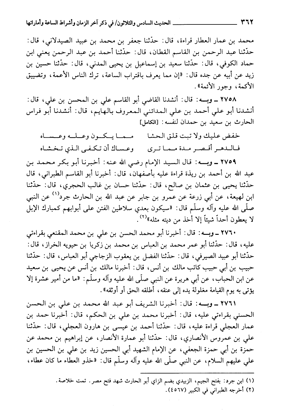 مُحَمَّدُ بْنُ عَمَّارٍ الْعَطَّارُ قِرَاءَةً، قَالَ: حَدَّثَنَا جَعْفَرُ بْنُ مُحَمَّدِ بْنِ عُبَيْدٍ الصَّيْدَلَانِيَّ، قَالَ: حَدَّثَنَا عَبْدُ الرَّحْمَنِ بْنُ الْقَاسِمِ الْقَطَّانُ، قَالَ: حَدَّثَنَا أَحْمَدُ بْنُ عَبْدِ الرَّحْمَنِ يَعْنِي ابْنَ حَمَّادٍ الْكُوفِيَّ، قَالَ: حَدَّثَنَا سَعِيدُ بْنُ إِسْمَاعِيلَ بْنِ يَحْيَى الْمَدَنِيُّ، قَالَ: حَدَّثَنَا حُسَيْنُ بْنُ زَيْدٍ، عَنْ أَبِيهِ، عَنْ جَدِّهِ، قَالَ: «إِنَّ مِمَّا يُعْرَفُ بِاقْتِرَابِ السَّاعَةِ، تَرْكُ النَّاسِ الْأَعِمَّةَ، وَتَضْيِيقُ الْأَكِمَّةِ، وَجَوْرُ الْأَئِمَّةِ»