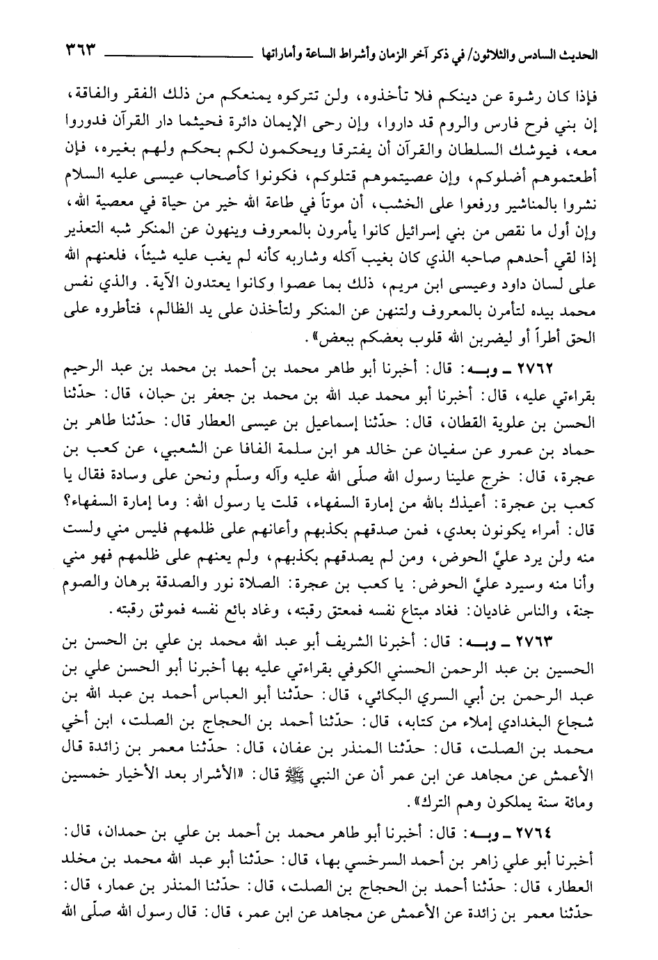 2763 - أَخْبَرَنَا أَبُو الشَّرِيفِ عَبْدُ اللَّهِ مُحَمَّدُ بْنُ عَلِيِّ بْنِ الْحَسَنِ بْنِ الْحُسَيْنِ بْنِ عَبْدِ الرَّحْمَنِ الْحَسَنِيُّ الكوفِي , بِقِرَاءَتِي عَلَيْهِ بِهَا أَخْبَرَنَا أَبُو الْحَسَنِ عَلِيُّ بْنُ عَبْدِ الرَّحْمَنِ بْنِ أَبِي السَّرِيِّ الْبُكَائِيُّ، قَالَ: حَدَّثَنَا أَبُو الْعَبَّاسِ أَحْمَدُ بْنُ عَبْدِ اللَّهِ بْنِ شُجَاعٍ الْبَغْدَادِيُّ، إِمْلَاءً مِنْ كِتَابِهِ، قَالَ: حَدَّثَنَا أَحْمَدُ بْنُ الْحَجَّاجِ بْنِ الصَّلْتِ، ابْنُ أَخِي مُحَمَّدُ بْنُ الصَّلْتِ، قَالَ: حَدَّثَنَا الْمُنْذِرُ بْنُ عَفَّانَ، قَالَ: حَدَّثَنَا مَعْمَرُ بْنُ زَائِدَةَ، قَالَ: الْأَعْمَشُ، عَنْ مُجَاهِدٍ، عَنِ ابْنِ عُمَرَ، أَنّ النَّبِيَّ صَلَّى اللَّهُ عَلَيْهِ وَسَلَّمَ، قَالَ: «الْأَشْرَارُ بَعْدَ الْأَخْيَارِ خَمْسِينَ وَمِائَةَ سَنَةٍ يَمْلِكُونَ , وَهُمُ التُّرْكُ»