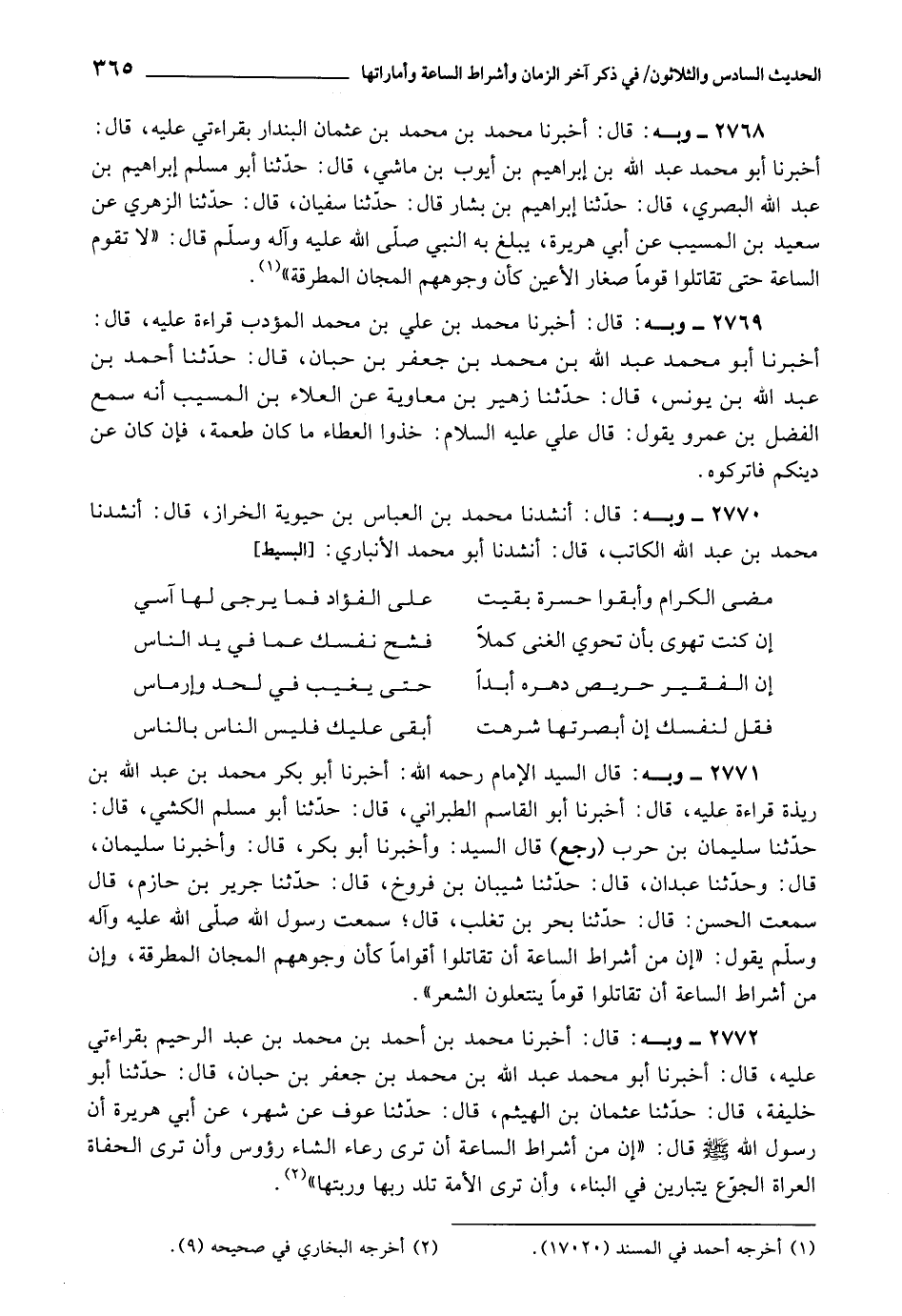 2771 - أَخْبَرَنَا أَبُو بَكْرٍ مُحَمَّدُ بْنُ عَبْدِ اللَّهِ بْنِ رَيْذَةَ , قِرَاءَةً عَلَيْهِ، قَالَ: أَخْبَرَنَا أَبُو الْقَاسِمِ الطَّبَرَانِيُّ، قَالَ: حَدَّثَنَا أَبُو مُسْلِمٍ الْكَشِيُّ، قَالَ: حَدَّثَنَا سُلَيْمَانُ بْنُ حَرْبٍ، رَجَعَ قَالَ السَّيِّدُ وَأَخْبَرَنَا أَبُو بَكْرٍ، قَالَ: وَأَخْبَرَنَا سُلَيْمَانُ، قَالَ: وَحَدَّثَنَا عَبْدَانُ، قَالَ: حَدَّثَنَا شَيْبَانُ بْنُ فَرَّوخٍ، قَالَ: حَدَّثَنَا جَرِيرُ بْنُ حَازِمٍ، قَالَ: سَمِعْتُ الْحَسَنَ قَالَ: حَدَّثَنَا عَمْرو بْنُ تَغْلِبَ، قَالَ: سَمِعْتُ رَسُولَ اللَّهِ صَلَّى اللَّهُ عَلَيْهِ وَآلِهِ وَسَلَّمَ يَقُولُ: «إِنَّ مِنْ أَشْرَاطِ السَّاعَةِ أَنْ تُقَاتِلُوا أَقْوَامًا كَأَنَّ وُجُوهَهُمُ الْمَجَانُّ الْمُطْرَقَةُ، وَإِنَّ مِنْ أَشْرَاطِ السَّاعَةِ أَنْ تُقَاتِلُوا قَوْمًا يَنْتَعِلُونَ الشَّعَرَ»