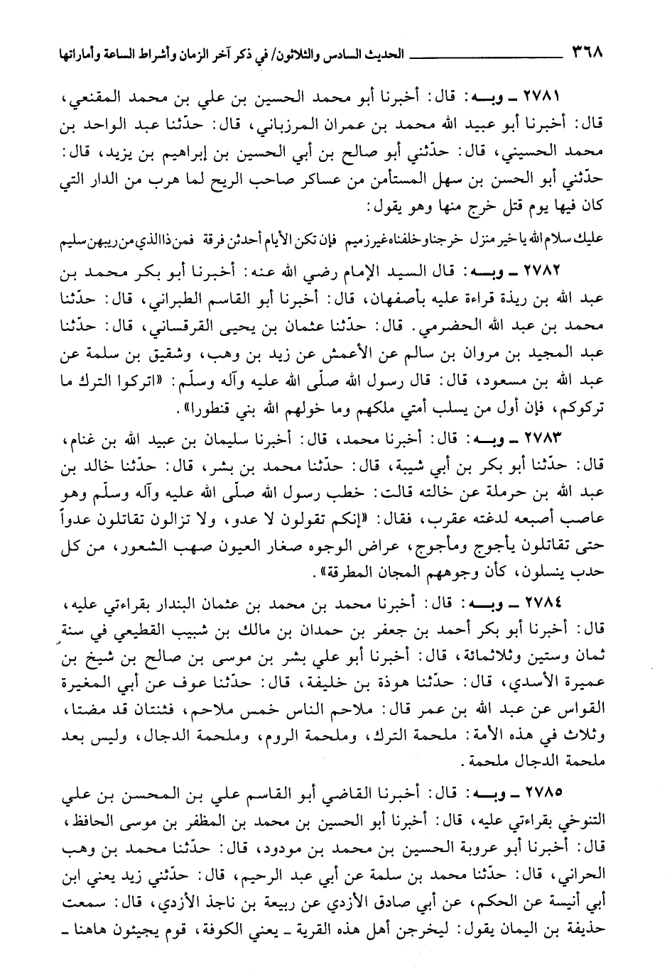 2784 - أَخْبَرَنَا مُحَمَّدُ بْنُ عُثْمَانَ الْبُنْدَارُ , بِقِرَاءَتِي عَلَيْهِ، قَالَ: أَخْبَرَنَا أَبُو بَكْرٍ أَحْمَدُ بْنُ جَعْفَرِ بْنِ حِمْدَانَ بْنِ مَالِكِ بْنِ شَبِيبٍ الْقَطِيعِيُّ فِي سَنَةِ ثَمَانٍ وَسِتِّينَ وَثَلاثِ مِائَةٍ، قَالَ: أَخْبَرَنَا أَبُو عَلِيٍّ بِشْرُ بْنُ مُوسَى بْنِ صَالِحِ بْنِ شَيْخِ بْنِ عُمَيْرَةَ الْأَسَدِيُّ، قَالَ: حَدَّثَنَا هَوْذَةُ بْنُ خَلِيفَةَ، قَالَ: حَدَّثَنَا عَوْفٌ، عَنْ أَبِي الْمُغِيرَةِ الْقَوَّاسُ، عَنْ عَبْدِ اللَّهِ بْنِ عُمَرَ، قَالَ: " مَلَاحِمُ النَّاسِ خَمْسَ مَلَاحِمَ، فَثِنْتَانِ قَدْ مَضَتَا، وَثَلَاثٌ فِي هَذِهِ الْأُمَّةِ: مَلْحَمَةُ التُّرْكِ، وَمَلْحَمَةُ الرُّومِ، وَمَلْحَمَةُ الدَّجَّالِ، وَلَيْسَ بَعْدَ مَلْحَمَةِ الدَّجَّالِ مَلْحَمَةٌ "