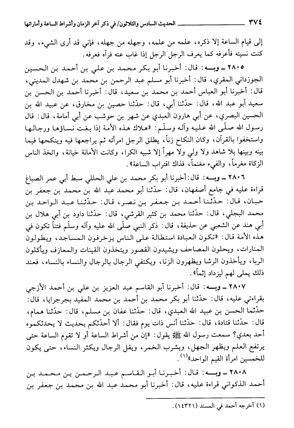 2805 - أَخْبَرَنَا أَبُو بَكْرٍ مُحَمَّدُ بْنُ عَلِيِّ بْنِ الْحُسَيْنِ بْنِ الْجَوْزَدَانِيِّ الْمُقْرِيُّ، قَالَ: أَخْبَرَنَا أَبُو مُسْلِمٍ عَبْدُ الرَّحْمَنِ بْنُ مُحَمَّدِ بْنِ شَهْدَلٍ الْمَدِينِيُّ، قَالَ: أَخْبَرَنَا أَبُو الْعَبَّاسِ أَحْمَدُ بْنُ مُحَمَّدِ بْنِ سَعِيدٍ، قَالَ: أَخْبَرَنَا أَحْمَدُ بْنُ الْحُسَيْنِ بْنِ سَعِيدٍ أَبُو عَبْدِ اللَّهِ، قَالَ: حَدَّثَنَا أَبِي، قَالَ: حَدَّثَنَا حُصَيْنُ بْنُ مُخَارِقٍ، عَنْ عُبَيْدِ اللَّهِ بْنِ الْحَسَنِ الْبَصْرِيِّ، عَنْ أَبِي هَارُونَ الْعَبْدِيِّ، عَنْ شَهْرِ بْنِ حَوْشَبٍ، عَنْ أَبِي أُمَامَةَ، قَالَ: قَالَ رَسُولُ اللَّهِ صَلَّى اللَّهُ عَلَيْهِ وَآلِهِ وَسَلَّمَ: «هَلَاكُ هَذِهِ الْأُمَّةِ , إِذَا بَغَتْ نِسَاؤُهَا , وَرِجَالُهَا , وَاسْتَخَّفُوا بِالْقُرْآنِ، وَكَانَ النِّكَاحُ زِنًا، يُطَلِّقُ الرَّجُلُ امْرَأَتَهُ , ثُمَّ يُرَاْجِعُهَا فِيهِ , وَيَنْكِحُهَا فِيمَا بَيْنَهُ , وَبَيْنَهَا بِلَا شَاهِدٍ , وَلَا وَلِيٍّ وَلَا مَهْرًا إِلَّا شَبِيهَ الْكَرَا، وَكَانَتِ الْأَمَانَةُ خِيَانَةً، وَاتَّخَذَ النَّاسُ الزَّكَاةَ مَغْرَمًا، وَالْفَيْءُ مَغْنَمَا، فَذَاكَ اقْتِرَابُ السَّاعَةِ»