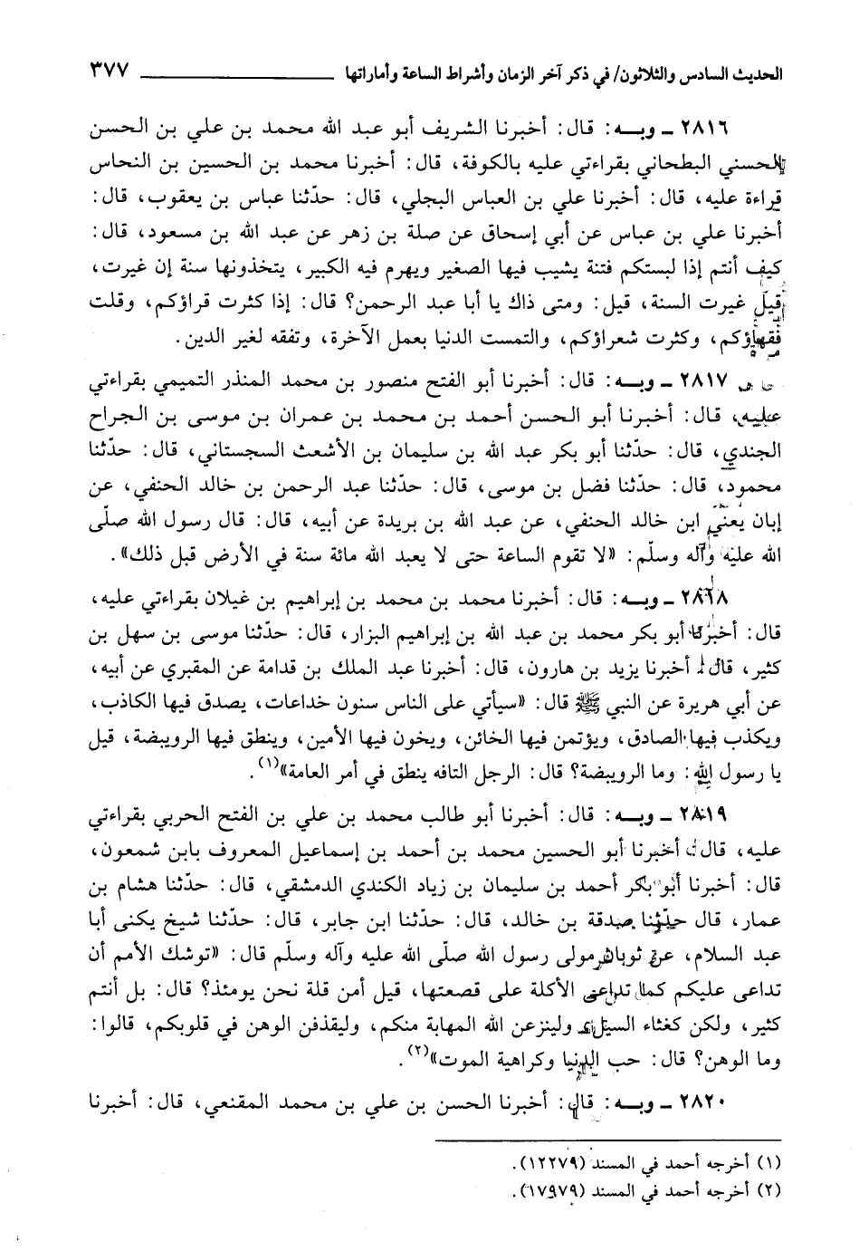 2819 - أَخْبَرَنَا أَبُو طَالِبٍ مُحَمَّدُ بْنُ عَلِيٍّ الْفَتْحُ الْحَرْبِيُّ , بِقِرَاءَتِي عَلَيْهِ، قَالَ: أَخْبَرَنَا أَبُو الْحُسَيْنِ مُحَمَّدُ بْنُ إِسْمَاعِيلَ الْمَعْرُوفُ بِابْنِ شَمْعُونَ، قَالَ: أَخْبَرَنَا أَبُو بَكْرٍ أَحْمَدُ بْنُ سُلَيْمَانَ بْنِ زِيَادٍ الْكَنَدِيُّ الدِّمَشْقِيُّ، قَالَ: حَدَّثَنَا هِشَامُ بْنُ عَمَّارٍ، قَالَ: حَدَّثَنَا صَدَقَةُ بْنُ خَالِدٍ، قَالَ: حَدَّثَنَا ابْنُ جَابِرٍ، قَالَ: حَدَّثَنَا شَيْخٌ يُكْنَى أَبَا عَبْدِ السَّلَامُ، عَنْ ثَوْبَانَ مَوْلَى رَسُولِ اللَّهِ صَلَّى اللَّهُ عَلَيْهِ وَآلِهِ وَسَلَّمَ، قَالَ: " تُوشِكُ الْأُمَمُ أَنْ تَدَاعَى عَلَيْكُمْ كَمَا تَدَاعَى الْأَكَلَةُ عَلَى قَصْعَتِهَا، قِيلَ: أَمِنْ قِلَةٍّ نَحْنُ يَوْمَئِذٍ؟ قَالَ: بَلْ أَنْتُمْ كَثِيرٌ، وَلَكِنْ كَغُثَاءِ السَّيْلِ، وَلَيَنْزَعَنَّ اللَّهُ الْمَهَابَةَ مِنْكُمْ، وَلَيَقْذِفَنَّ الْوَهَنَ فِي قُلُوبِكُمْ، قَالُوا: وَمَا الْوَهَنُ؟ ، قَالَ: حُبُّ الدُّنْيَا , وَكَرَاهِيَةُ الْمَوْتِ "