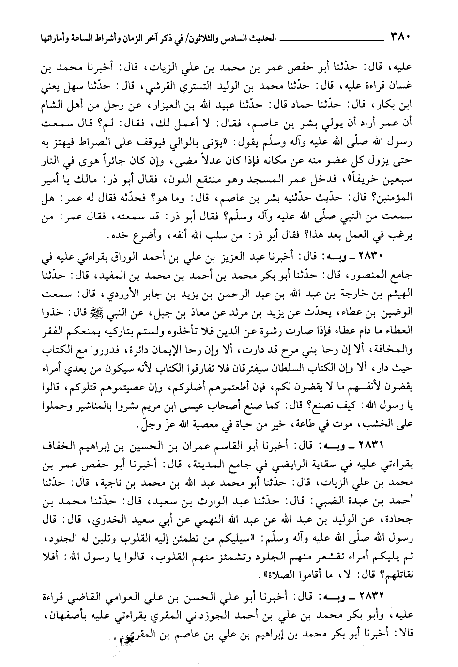 2831 - أَخْبَرَنَا أَبُو الْقَاسِمِ عِمْرَانُ بْنُ الْحُسَيْنِ بْنِ إِبْرَاهِيمَ الْخَفَّافُ بِقِرَاءَتِي عَلَيْهِ فِي سِقَايَةِ الرَّايِضِي فِي جَامِعِ الْمَدِينَةِ، قَالَ: أَخْبَرَنَا أَبُو حَفْصٍ عُمَرُ بْنُ مُحَمَّدِ بْنِ عَلِيٍّ الزَّيَّاتُ، قَالَ: حَدَّثَنَا أَبُو مُحَمَّدٍ عَبْدُ اللَّهِ بْنُ مُحَمَّدِ بْنِ نَاجِيَةَ، قَالَ: حَدَّثَنَا أَحْمَدُ بْنُ عَبْدَةَ الضَّبِّيُّ، قَالَ: حَدَّثَنَا عَبْدُ الْوَارِثِ بْنُ سَعِيدٍ، قَالَ: حَدَّثَنَا مُحَمَّدُ بْنُ جَحَادَةَ، عَنِ الْوَلِيدِ بْنِ عَبْدِ اللَّهِ، عَنْ عَبْدِ اللَّهِ النَّهَمِيُّ، عَنْ أَبِي سَعِيدٍ الْخُدْرِيِّ، قَالَ: قَالَ رَسُولُ اللَّهِ صَلَّى اللَّهُ عَلَيْهِ وَآلِهِ وَسَلَّمَ: " سَيَلِيكُمْ مَنْ تَطْمَئِنُّ إِلَيْهِ الْقُلُوبُ , وَتَلِينُ لَهُ الْجُلُودُ، ثُمَّ يَلِيكُمْ أُمَرَاءُ تَقْشَعِرُّ مِنْهُمُ الْجُلُودُ، وَتَشْمَئِزُّ مِنْهُمُ الْقُلُوبُ، قَالُوا: يَا رَسُولَ اللَّهِ، أَفَلَا نُقَاتِلُهُمْ؟ قَالَ: لَا، مَا أَقَامُوا الصَّلَاةَ "