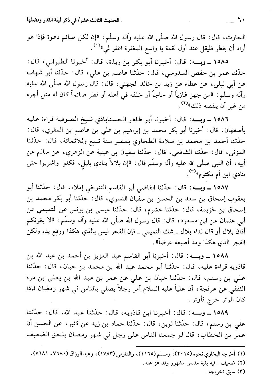 1586 - أَخْبَرَنَا أَبُو طَاهِرٍ الْحَسَنابَاذِي شَيْخُ الصُّوفِيَّةِ، قِرَاءَةً عَلَيْهِ بِأَصْفَهَانَ، قَالَ: أَخْبَرَنَا أَبُو بَكْرٍ مُحَمَّدُ بْنُ إِبْرَاهِيمَ بْنِ عَلِيِّ بْنِ عَاصِمِ بْنِ الْمُقْرِيِّ، قَالَ: حَدَّثَنَا أَحْمَدُ بْنُ مُحَمَّدِ بْنِ سَلَامَةَ الطَّحَاوِيُّ بِمِصْرَ سَنَةَ تِسْعٍ وَثَلاثِ مِائَةٍ، قَالَ: حَدَّثَنَا الْمُزْنِيُّ، قَالَ: حَدَّثَنَا الشَّافِعِيُّ، قَالَ: حَدَّثَنَا سُفْيَانُ بْنُ عُيَنْيَةَ، عَنِ الزُّهْرِيِّ، عَنْ سَالِمٍ، عَنْ أَبِيهِ، أَنّ النَّبِيَّ صَلَّى اللَّهُ عَلَيْهِ وَآلِهِ وَسَلَّمَ، قَالَ: «إِنَّ بِلَالًا يُنَادِي بِلَيْلٍ، فَكُلُوا , وَاشْرَبُوا , حَتَّى يُنَادِي ابْنُ أُمِّ مَكْتُومٍ»