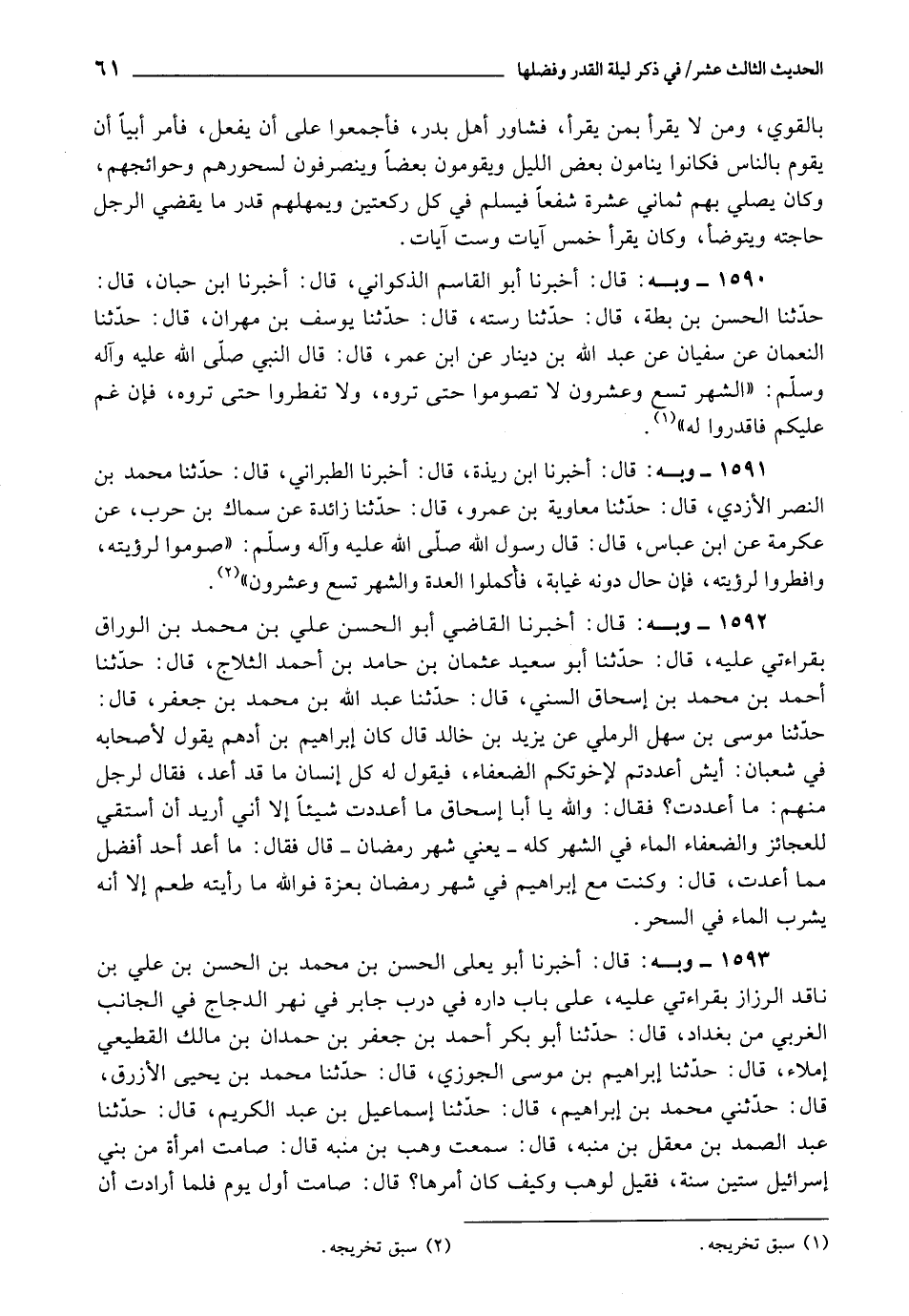 1590 - أَخْبَرَنَا أَبُو الْقَاسِمِ الذَّكْوَانِيُّ، قَالَ: أَخْبَرَنَا ابْنُ حِبَّانَ، قَالَ: حَدَّثَنَا الْحَسَنُ بْنُ بَطَّةَ، قَالَ: حَدَّثَنَا رُسْتَةُ، قَالَ: حَدَّثَنَا يُوسُفُ بْنُ مَهْرَانَ، قَالَ: حَدَّثَنَا النُّعْمَانُ، عَنْ سُفْيَانَ، عَنْ عَبْدِ اللَّهِ بْنِ دِينَارٍ، عَنِ ابْنِ عُمَرَ، قَالَ: قَالَ النَّبِيُّ صَلَّى اللَّهُ عَلَيْهِ وَآلِهِ وَسَلَّمَ: «الشَّهْرُ تِسْعٌ وَعِشْرُونَ لَا تَصُومُوا , حَتَّى تَرَوْهُ، وَلَا تُفْطِرُوا , حَتَّى تَرَوْهُ، فَإِنْ غُمَّ عَلَيْكُمْ , فَاقْدُرُوا لَهُ»