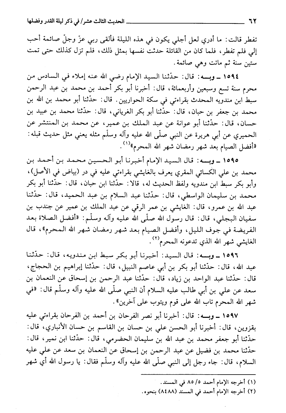 1595 - أَخْبَرَنَا أَبُو الْحُسَيْنِ مُحَمَّدُ بْنُ أَحْمَدَ بْنِ مُحَمَّدِ بْنِ عَلِيٍّ الْكِسَائِيُّ الْمُقْرِيُّ , يُعْرَفُ بِالْغَايِشِيِّ، بِقِرَاءَتِي عَلَيْهِ فِي دُرِّ بَيَاضٍ فِي الْأَصْلِ، وَأَبُو بَكْرٍ سَبْطُ بْنُ مَنْدَوَيْهِ , وَلَفْظُ الْحَدِيثِ لَهُ، قَالَا: حَدَّثَنَا ابْنُ حِبَّانَ، قَالَ: حَدَّثَنَا أَبُو بَكْرٍ مُحَمَّدُ بْنُ سُلَيْمَانَ الْوَاسِطِيُّ، قَالَ: حَدَّثَنَا عَبْدُ السَّلَامِ بْنُ عَبْدِ الْحَمِيدِ، قَالَ: حَدَّثَنَا عَبْدُ اللَّهِ بْنُ عَمْرٍو، قَالَ: الْعَائِشِيُّ بْنُ عُمَرَ الرَّقِّيُّ، عَنْ عَبْدِ الْمَلِكِ بْنِ عُمَيْرٍ، عَنْ جُنْدُبِ بْنِ سُفْيَانَ الْبَجَلِيِّ، قَالَ: قَالَ رَسُولُ اللَّهِ صَلَّى اللَّهُ عَلَيْهِ وَآلِهِ وَسَلَّمَ: «أَفْضَلُ الصَّلَاةِ بَعْدَ الْفَرِيضَةِ فِي جَوْفِ اللَّيْلِ، وَأَفْضَلُ الصِّيَامِ بَعْدَ شَهْرِ رَمَضَانَ شَهْرُ اللَّهِ الْمُحَرَّمُ» .