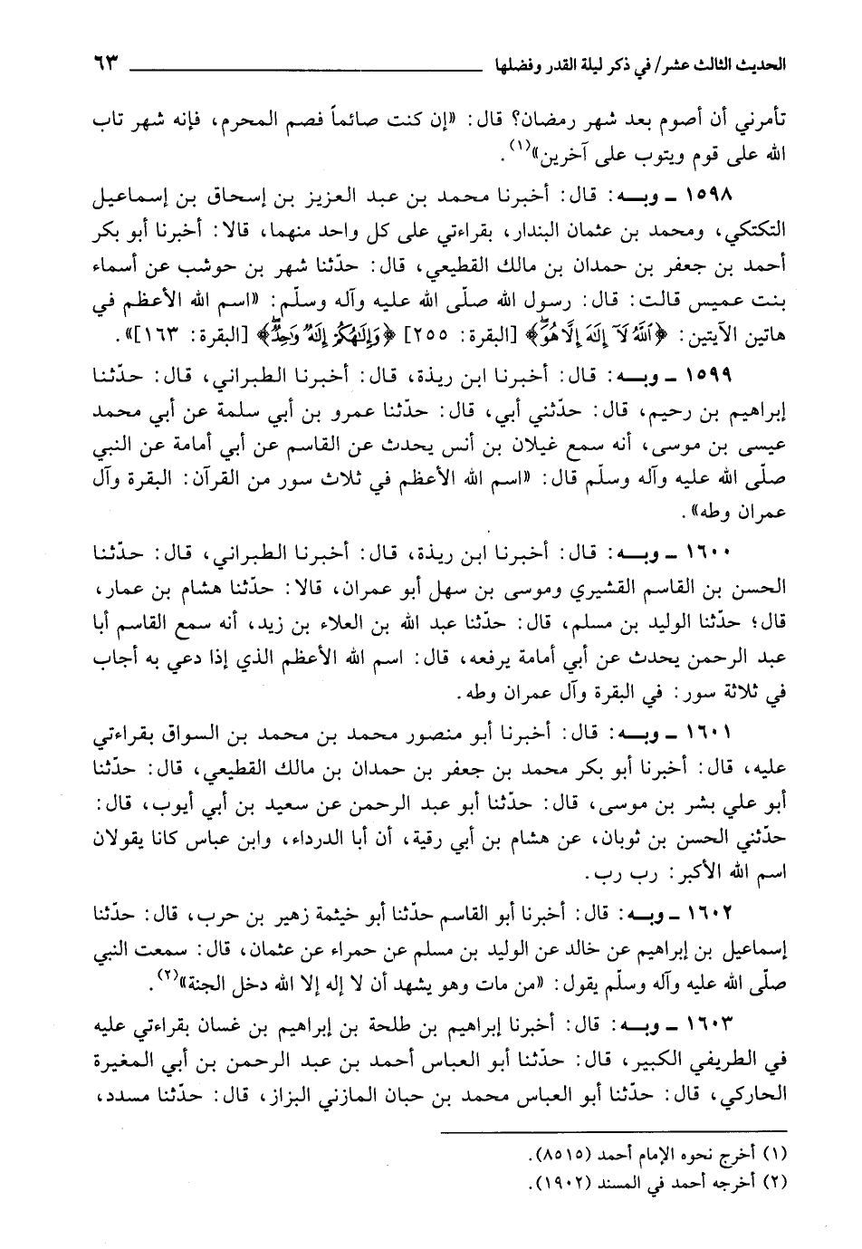 1598 - أَخْبَرَنَا مُحَمَّدُ بْنُ عَبْدِ الْعَزِيزِ بْنِ إِسْحَاقَ بْنِ إِسْمَاعِيلَ التَّكْتَكِيُّ , وَمُحَمَّدُ بْنُ عُثْمَانَ الْبُنْدَارُ، بِقِرَاءَتِي عَلَى كُلِّ وَاحِدٍ مِنْهُمَا، قَالَا: أَخْبَرَنَا أَبُو بَكْرٍ أَحْمَدُ بْنُ جَعْفَرِ بْنِ حَمْدَانَ بْنِ مَالِكٍ الْقَطِيعِيُّ، قَالَ: حَدَّثَنَا شَهْرُ بْنُ حَوْشَبٍ، عَنْ أَسْمَاءَ بِنْتَ عُمَيْسٍ، قَالَتْ: قَالَ رَسُولُ اللَّهِ صَلَّى اللَّهُ عَلَيْهِ وَآلِهِ وَسَلَّمَ: " اسْمُ اللَّهِ الْأَعْظَمُ فِي هَاتَيْنِ الْآيَتَيْنِ {اللَّهُ لا إِلَهَ إِلا هُوَ} [البقرة: 255] ، {وَإِلَهُكُمْ إِلَهٌ وَاحِدٌ} [البقرة: 163] "