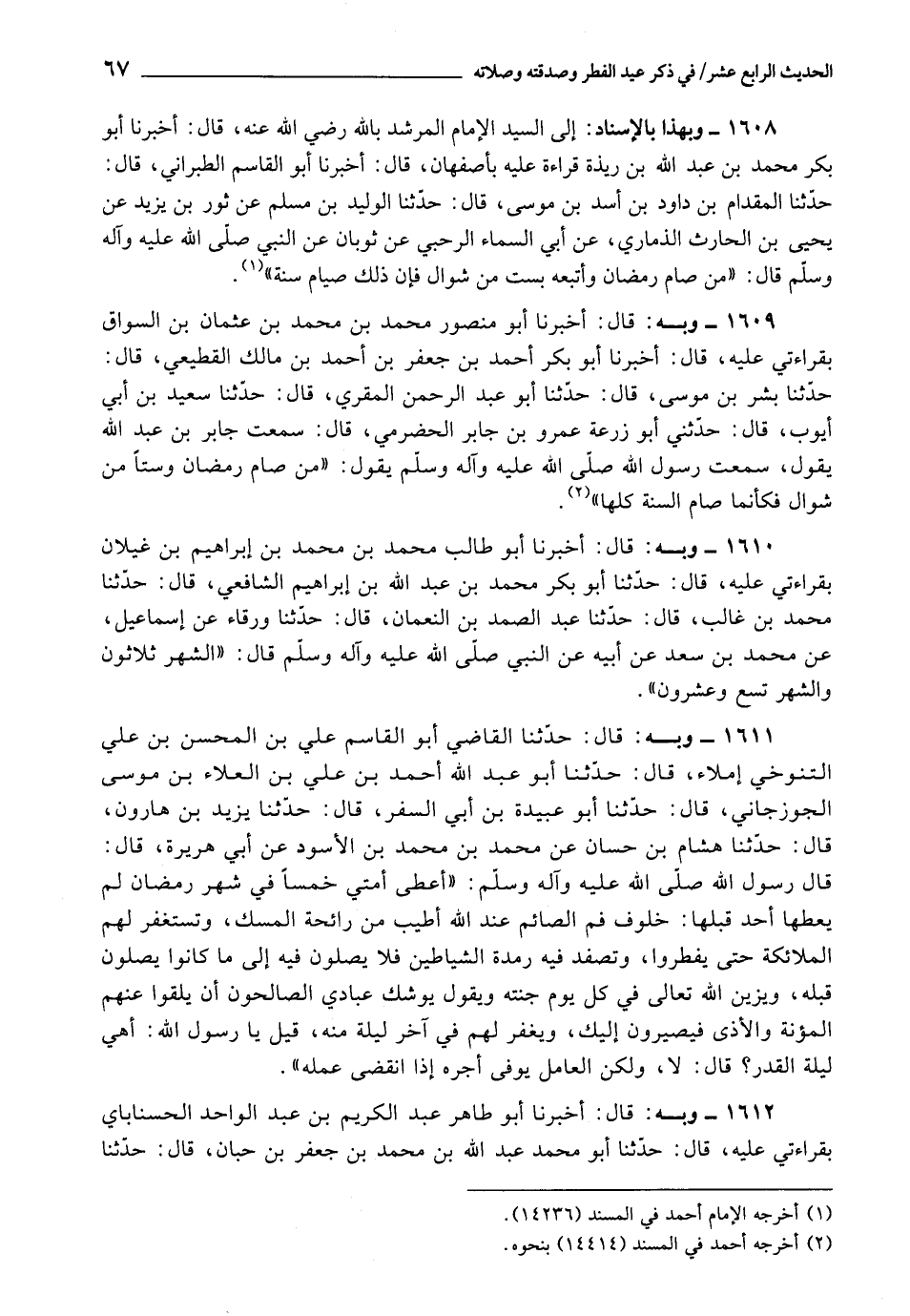 1609 - أَخْبَرَنَا أَبُو مَنْصُورٍ مُحَمَّدُ بْنُ مُحَمَّدِ بْنِ عُثْمَانَ بْنِ السَّوَّاقِ، بِقِرَاءَتِي عَلَيْهِ، قَالَ: أَخْبَرَنَا أَبُو بَكْرٍ أَحْمَدُ بْنُ جَعْفَرِ بْنِ أَحْمَدَ بْنِ مَالِكٍ الْقَطِيعِيُّ، قَالَ: حَدَّثَنَا بِشْرُ بْنُ مُوسَى، قَالَ: حَدَّثَنَا أَبُو عَبْدِ الرَّحْمَنِ الْمُقْرِيُّ، قَالَ: حَدَّثَنَا سَعِيدُ بْنُ أَبِي أَيُّوبَ، قَالَ: حَدَّثَنِي أَبُو زُرْعَةَ عَمْرُو بْنُ جَابِرٍ الْحَضْرَمِيُّ، قَالَ: سَمِعْتُ جَابِرَ بْنَ عَبْدِ اللَّهِ، يَقُولُ: سَمِعْتُ رَسُولَ اللَّهِ صَلَّى اللَّهُ عَلَيْهِ وَآلِهِ وَسَلَّمَ يَقُولُ: «مَنْ صَامَ رَمَضَانَ وَسِتًّا مِنْ شَوَّالٍ , فَكَأنَّمَا صَامَ السَّنَةَ كُلَّهَا»