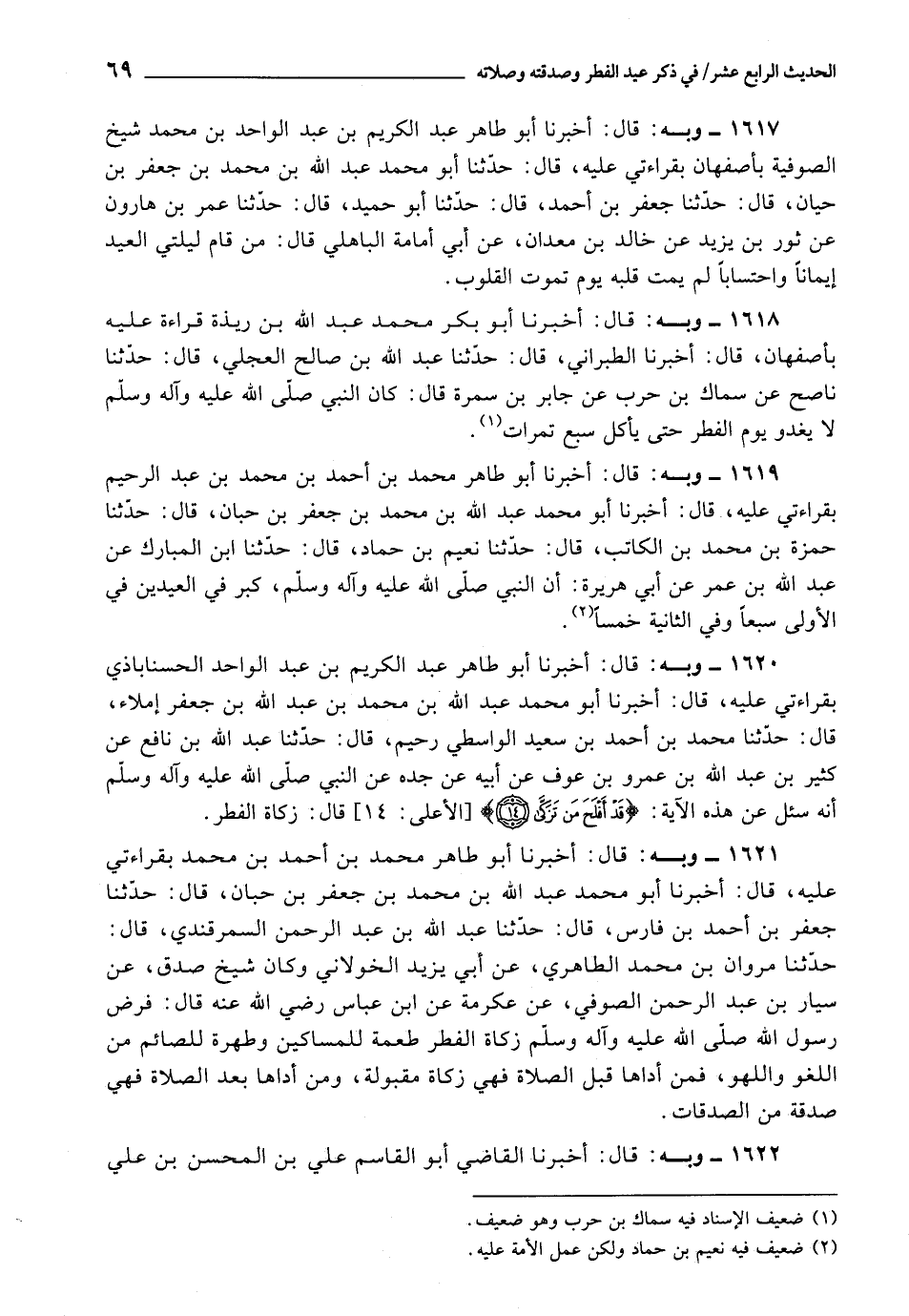 1620 - أَخْبَرَنَا أَبُو طَاهِرٍ عَبْدُ الْكَرِيمِ بْنُ عَبْدِ الْوَاحِدِ الْحَسَنَابَاذِي، بِقِرَاءَتِي عَلَيْهِ، قَالَ: أَخْبَرَنَا أَبُو مُحَمَّدٍ عَبْدُ اللَّهِ بْنُ مُحَمَّدِ بْنِ عَبْدِ اللَّهِ بْنِ جَعْفَرٍ، إِمْلَاءً، قَالَ: حَدَّثَنَا مُحَمَّدُ بْنُ أَحْمَدَ بْنِ سَعِيدٍ الْوَاسِطِيُّ رُحَيْمٌ، قَالَ: حَدَّثَنَا عَبْدُ اللَّهِ بْنُ نَافِعٍ، عَنْ كَثِيرِ بْنِ عَبْدِ اللَّهِ بْنِ عَمْرِو بْنِ عَوْفٍ، عَنْ أَبِيهِ، عَنْ جَدِّهِ، عَنِ النَّبِيِّ صَلَّى اللَّهُ عَلَيْهِ وَآلِهِ وَسَلَّمَ أَنَّهُ سُئِلَ عَنْ هَذِهِ الْآيَةِ " {قَدْ أَفْلَحَ مَنْ تَزَكَّى} [الأعلى: 14] ، قَالَ: زَكَاةُ الْفِطْرِ "