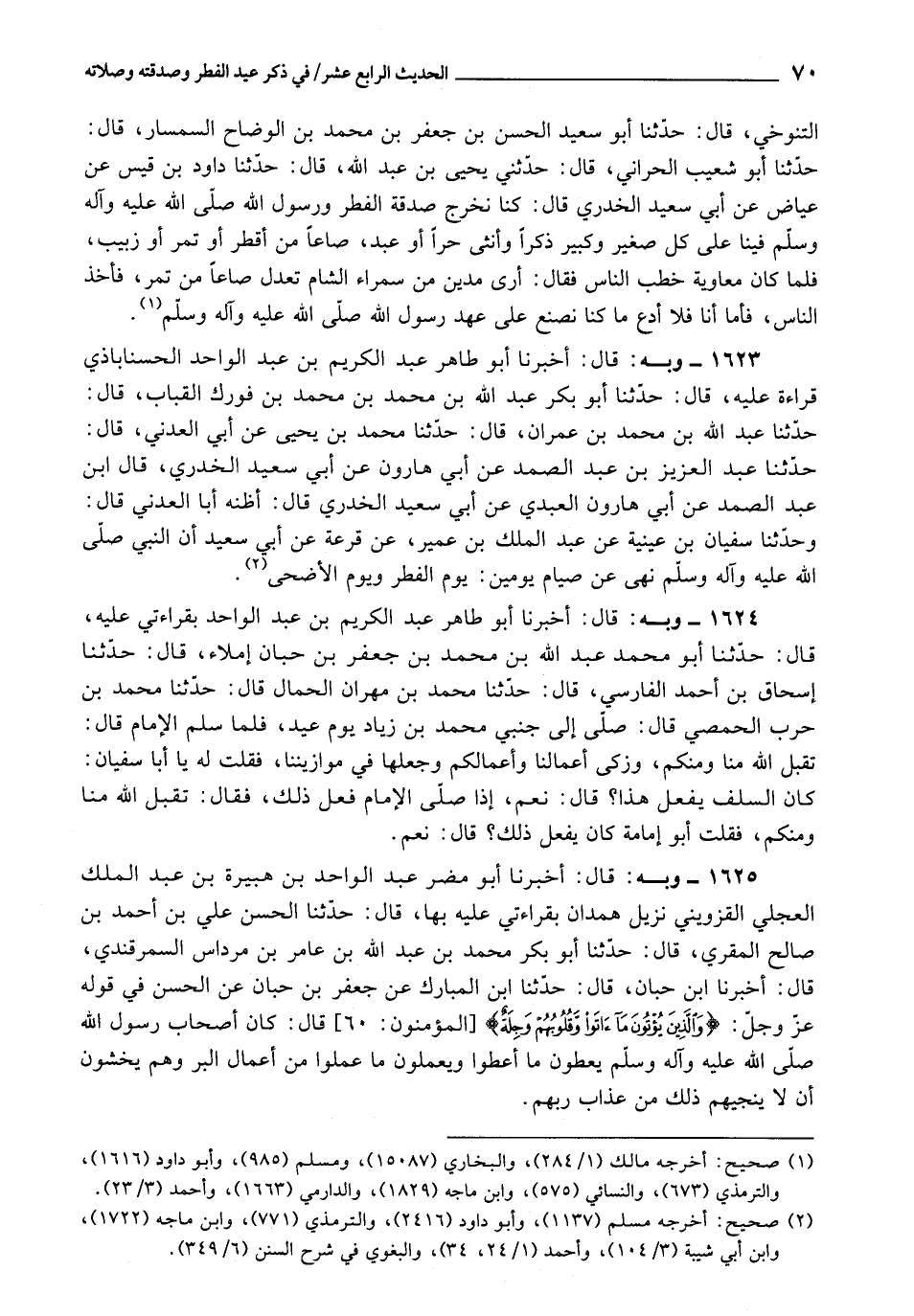1624 - أَخْبَرَنَا أَبُو طَاهِرٍ عَبْدُ الْكَرِيمِ بْنُ عَبْدِ الْوَاحِدِ، بِقِرَاءَتِي عَلَيْهِ، قَالَ: حَدَّثَنَا أَبُو مُحَمَّدٍ عَبْدُ اللَّهِ بْنُ مُحَمَّدِ بْنِ جَعْفَرِ بْنِ حِبَّانَ، إِمْلَاءً، قَالَ: حَدَّثَنَا إِسْحَاقُ بْنُ أَحْمَدَ الْفَارِسِيُّ، قَالَ: حَدَّثَنَا مُحَمَّدُ بْنُ مَهْرَانَ الْحَمَّالُ، قَالَ: حَدَّثَنَا مُحَمَّدُ بْنُ حَرْبٍ الْحِمْصِيُّ، قَالَ: صَلَّى إِلَى جَانِبِي مُحَمَّدُ بْنُ زِيَادٍ يَوْمَ عِيدٍ، " فَلَمَّا سَلَّمَ الْإِمَامُ قَالَ: تَقَبَّلَ اللَّهُ مِنَّا وَمِنْكُمْ، وَزَكَّى أَعْمَالَنَا وَأَعْمَالَكُمْ , وَجَعَلَهَا فِي مَوَازِينِنَا، فَقُلْتُ لَهُ يَا أَبَا سُفْيَانَ: كَانَ السَّلَفُ يَفْعَلُ هَذَا؟ قَالَ: نَعَمْ، إِذَا صَلَّى الْإِمَامُ , فَعَلَ ذَلِكَ، فَقَالَ: تَقَبَّلَ اللَّهُ مِنَّا وَمِنْكُمْ، فَقُلْتُ: أَبُو أُمَامَةَ كَانَ يَفْعَلُ ذَلِكَ؟ قَالَ: نَعَمْ "