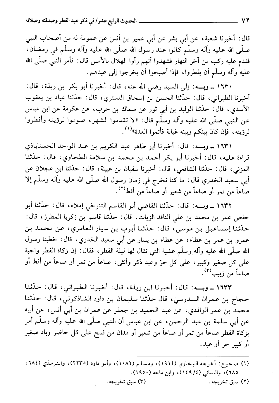 1633 - أَخْبَرَنَا ابْنُ رَيْذَةَ، قَالَ: أَخْبَرَنَا الطَّبَرَانِيُّ، قَالَ: حَدَّثَنَا حَجَّاجُ بْنُ عِمْرَانَ السَّدُوسِيُّ، قَالَ: حَدَّثَنَا سُلَيْمَانُ بْنُ دَاوُدَ الشَّاذَكُونِيُّ، قَالَ: حَدَّثَنَا مُحَمَّدُ بْنُ عُمَرَ الْوَاقِدِيُّ، عَنْ عَبْدِ الْحَمِيدِ بْنِ جَعْفَرٍ، عَنْ عُمَرَ بْنِ أَبِي أَنَسٍ، عَنْ أَبِيهِ، عَنْ أَبِي سَلَمَةَ بْنِ عَبْدِ الرَّحْمَنِ، عَنِ ابْنِ عَبَّاسٍ، أَنّ النَّبِيَّ صَلَّى اللَّهُ عَلَيْهِ وَآلِهِ وَسَلَّمَ «أَمَرَ بِزَكَاةِ الْفِطْرِ صَاعًا مِنْ تَمْرٍ، أَوْ صَاعًا مِنْ شَعِيرٍ، أَوْ مُدَّانِ مِنْ قَمْحٍ، عَلَى كُلِّ حَاضِرٍ وَبَادٍ، صَغِيرٍ أَوْ كَبِيرٍ، حُرٍّ أَوْ عَبْدٍ»