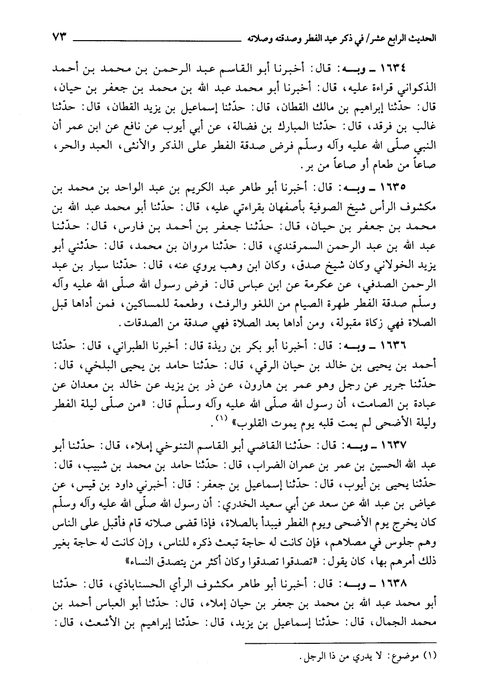 1634 - أَخْبَرَنَا أَبُو الْقَاسِمِ عَبْدُ الرَّحْمَنِ بْنُ مُحَمَّدِ بْنِ أَحْمَدَ الذَّكْوَانِيُّ، قِرَاءَةً عَلَيْهِ، قَالَ: أَخْبَرَنَا أَبُو مُحَمَّدٍ عَبْدُ اللَّهِ بْنُ مُحَمَّدِ بْنِ جَعْفَرِ بْنِ حَيَّانَ، قَالَ: حَدَّثَنَا إِبْرَاهِيمُ بْنُ مَالِكٍ الْقَطَّانُ، قَالَ: حَدَّثَنَا إِسْمَاعِيلُ بْنُ يَزِيدَ الْقَطَّانُ، قَالَ: حَدَّثَنَا غَالِبُ بْنُ فَرْقَدٍ، قَالَ: حَدَّثَنَا الْمُبَارَكُ بْنُ فَضَالَةَ، عَنْ أَبِي أَيُّوبَ، عَنْ نَافِعِ، عَنْ ابْنِ عُمَرَ، أَنّ النَّبِيَّ صَلَّى اللَّهُ عَلَيْهِ وَآلِهِ وَسَلَّمَ «فَرَضَ صَدَقَةَ الْفِطْرِ عَلَى الذَّكَرِ وَالْأُنْثَى، الْعَبْدِ وَالْحُرِّ، صَاعًا مِنْ طَعَامٍ، أَوْ صَاعًا مِنْ بُرٍّ»