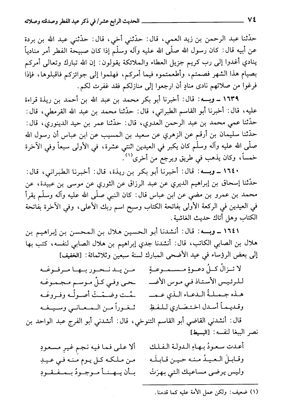 1639 - أَخْبَرَنَا أَبُو بَكْرٍ مُحَمَّدُ بْنُ عَبْدِ اللَّهِ بْنِ أَحْمَدَ بْنِ رَيْذَةَ، قِرَاءَةً عَلَيْهِ، قَالَ: أَخْبَرَنَا أَبُو الْقَاسِمِ الطَّبَرَانِيُّ، قَالَ: حَدَّثَنَا مُحَمَّدُ بْنُ عَبْدِ اللَّهِ الْقِرْمِطِيُّ، قَالَ: حَدَّثَنَا عَمِّي مُحَمَّدُ بْنُ عَبْدِ الرَّحْمَنِ الْعَدَوِيُّ، قَالَ: حَدَّثَنَا عُمَرُ بْنُ حِيدٍ الدِّينَوَرِيُّ، قَالَ: حَدَّثَنَا سُلَيْمَانُ بْنُ أَرْقَمَ، عَنِ الزُّهْرِيِّ، عَنْ سَعِيدِ بْنِ الْمُسَيِّبِ، عَنِ ابْنِ عَبَّاسٍ، أَنّ رَسُولَ اللَّهِ صَلَّى اللَّهُ عَلَيْهِ وَآلِهِ وَسَلَّمَ كَانَ «يُكَبِّرُ فِي الْعِيدَيْنِ اثْنَتَيْ عَشْرَةَ، فِي الْأُولَى سَبْعًا , وَفِي الْآخِرَةِ خَمْسًا، وَكَانَ يَذْهَبُ فِي طَرِيقٍ , وَيَرْجِعُ مِنْ أُخْرَى»
