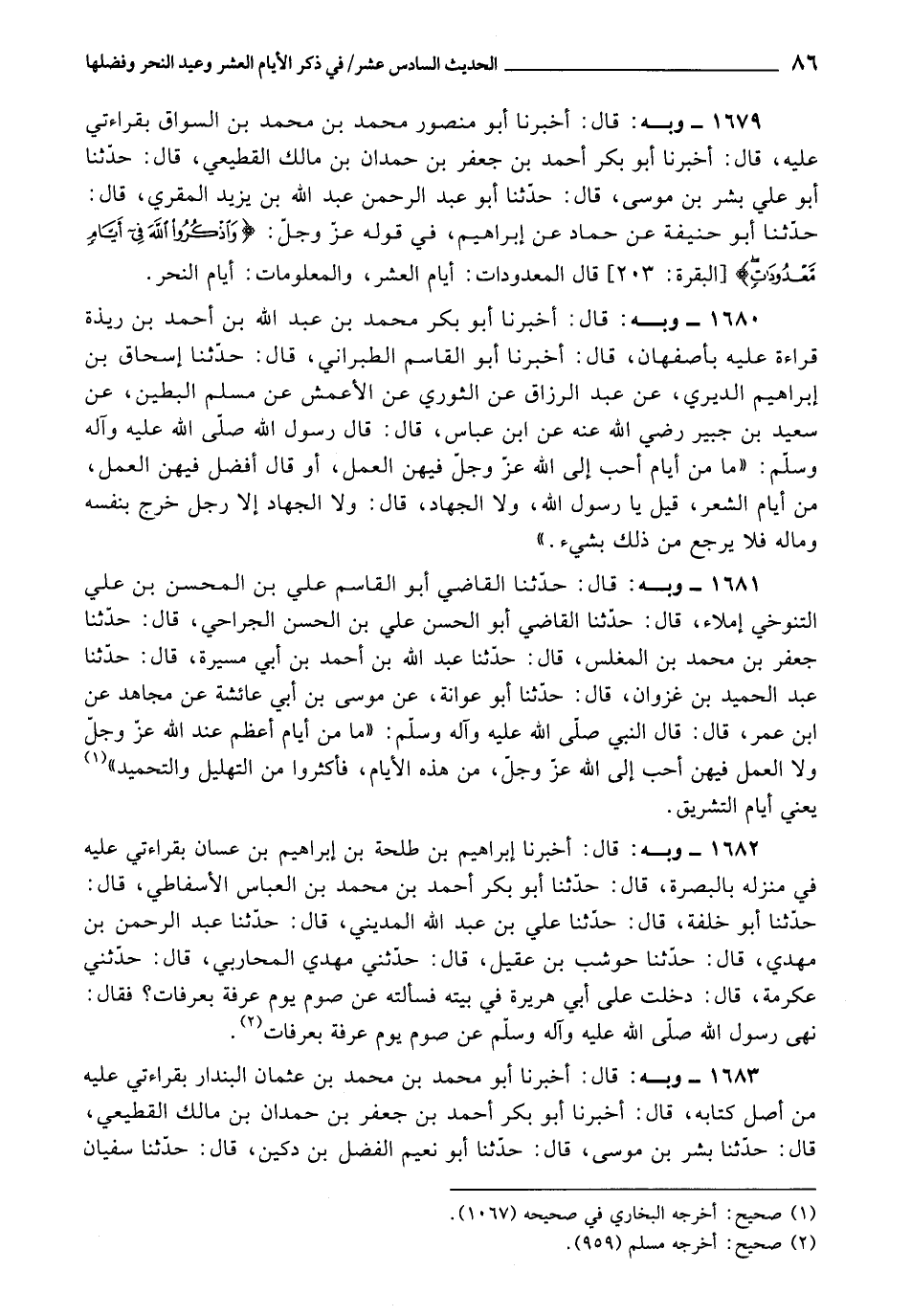 1680 - قَالَ: أَخْبَرَنَا أَبُو بَكْرٍ مُحَمَّدُ بْنُ عَبْدِ اللَّهِ بْنِ أَحْمَدَ بْنِ رَيْذَةَ، قِرَاءَةً عَلَيْهِ بِأَصْفَهَانَ، قَالَ: أَخْبَرَنَا أَبُو الْقَاسِمِ الطَّبَرَانِيُّ، قَالَ: حَدَّثَنَا إِسْحَاقُ بْنُ إِبْرَاهِيمَ الدَّيْرِيُّ، عَنْ عَبْدِ الرَّزَّاقِ، عَنِ الثَّوْرِيِّ، عَنِ الْأَعْمَشِ، عَنْ مُسْلِمٍ الْبَطِينِ، عَنْ سَعِيدِ بْنِ جُبَيْرٍ رَضِيَ اللَّهُ عَنْهُ، عَنِ ابْنِ عَبَّاسٍ، قَالَ: قَالَ رَسُولُ اللَّهِ صَلَّى اللَّهُ عَلَيْهِ وَآلِهِ وَسَلَّمَ: " مَا مِنْ أَيَّامٍ أَحَبُّ إِلَى اللَّهِ عَزَّ وَجَلَّ فِيهِنَّ الْعَمَلُ، أَوْ قَالَ أَفْضَلُ فِيهِنَّ الْعَمَلُ، مِنْ أَيَّامِ الْعَشْرِ، قِيلَ: يَا رَسُولَ اللَّهِ، وَلَا الْجِهَادُ، قَالَ: وَلَا الْجِهَادُ , إِلَّا رَجُلٌ خَرَجَ بِنَفْسِهِ وَمَالِهِ , فَلَا يَرْجِعُ مِنْ ذَلِكَ بِشَيْءٍ "