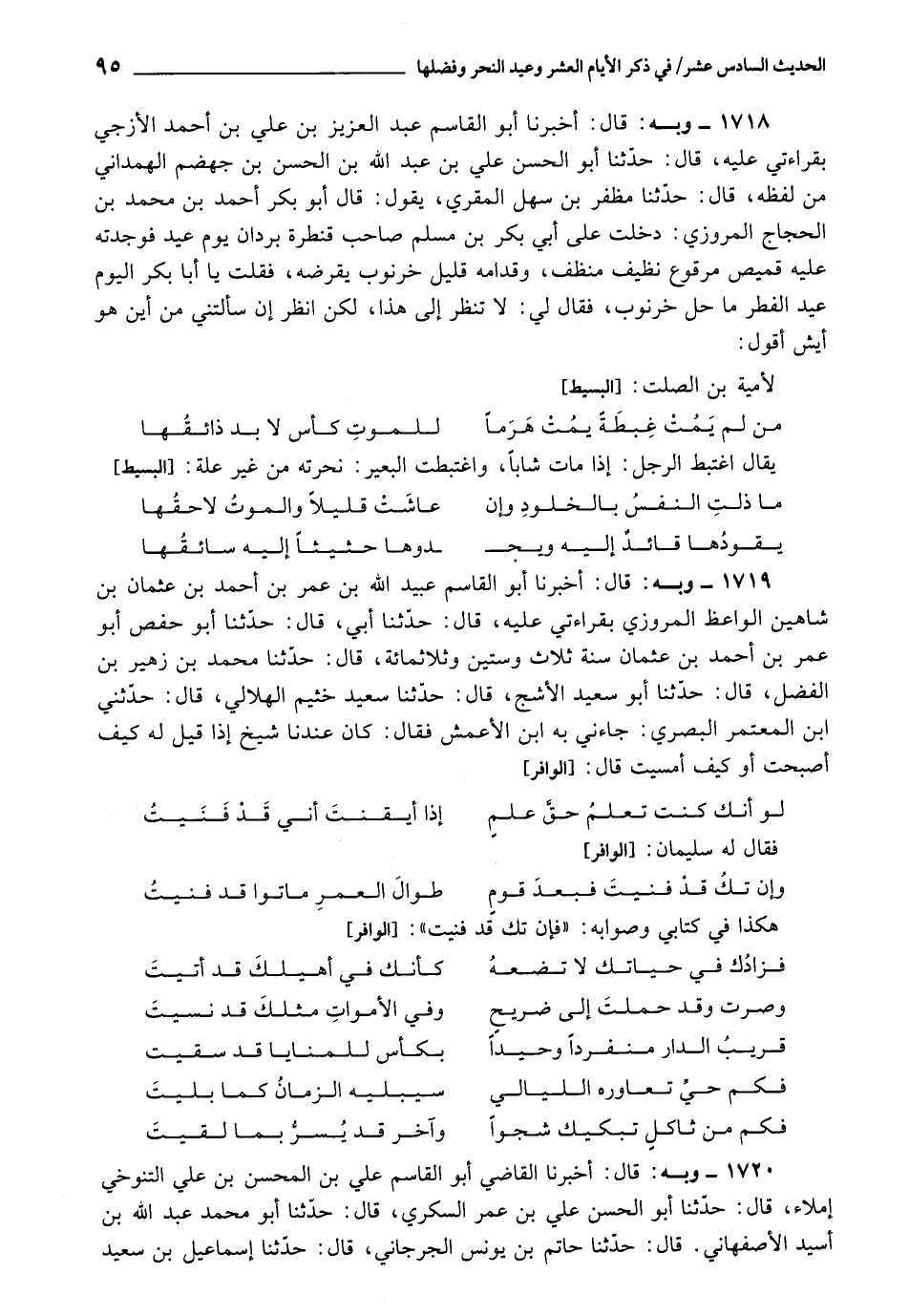 1718 - أَخْبَرَنَا أَبُو الْقَاسِمِ عَبْدُ الْعَزِيزِ بْنُ عَلِيِّ بْنِ أَحْمَدَ الْأَزَجِيُّ، بِقِرَاءَتِي عَلَيْهِ، قَالَ: وَحَدَّثَنَا أَبُو الْحَسَنِ عَلِيُّ بْنُ عَبْدِ اللَّهِ بْنِ الْحَسَنِ بْنِ جَهْضَمٍ الْهَمْدَانِيُّ , مِنْ لَفْظِهِ، قَالَ: حَدَّثَنَا مُظَفَّرُ بْنُ سَهْلٍ الْمُقْرِيُّ، يَقُولُ: قَالَ: أَبُو بَكْرٍ أَحْمَدُ بْنُ مُحَمَّدِ بْنِ الْحَجَّاجِ الْمَرْوَزِيُّ: دَخَلْتُ عَلَى أَبِي بَكْرِ بْنِ مُسْلِمٍ صَاحِبِ قَنْطَرَةِ بْنِ بَرَدَانَ يَوْمَ عِيدٍ , فَوَجَدْتُهُ عَلَيْهِ قَمِيصٌ مَرْقُوعُ نَظِيفٌ مُنَظَّفٌ، وَقُدَّامُهُ قَلِيلٌ خَرْنُوبٌ يَقْرِضُهُ، فَقُلْتُ يَا أَبَا بَكْرٍ الْيَوْمُ عِيدُ الْفِطْرِ مَا حَلَّ خَرْنُوبٌ، فَقَالَ لِي: لَا تَنْظُرْ إِلَيَّ هَكَذَا، لَكِنِ انْظُرْ إِنْ سَأَلْتَنِي مِنْ أَيْنَ هُوَ أَيْشٍ أَقُولُ: لِأُمَيَّةَ بْنِ الصَّلْتِ: