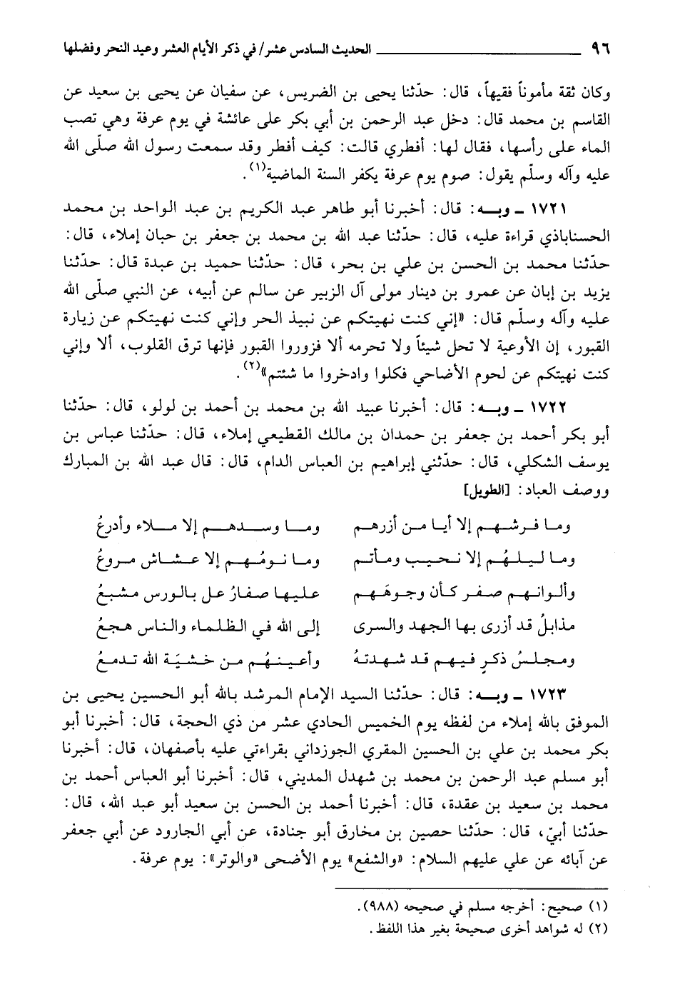 1722 - أَخْبَرَنَا عُبَيْدُ اللَّهِ بْنُ مُحَمَّدِ بْنِ أَحْمَدَ بْنِ لُولُو، قَالَ: حَدَّثَنَا أَبُو بَكْرٍ أَحْمَدُ بْنُ جَعْفَرِ بْنِ حَمْدَانَ بْنِ مَالِكٍ الْقَطِيعِيُّ، إِمْلَاءً، قَالَ: حَدَّثَنَا عَبَّاسُ بْنُ يُوسُفَ الشِّكْلِيُّ، قَالَ: حَدَّثَنِي إِبْرَاهِيمُ بْنُ الْعَبَّاسِ الدَّامُ، قَالَ: قَالَ عَبْدُ اللَّهِ بْنُ الْمُبَارَكِ , وَوَصَفَ الْعِبَادَ:
