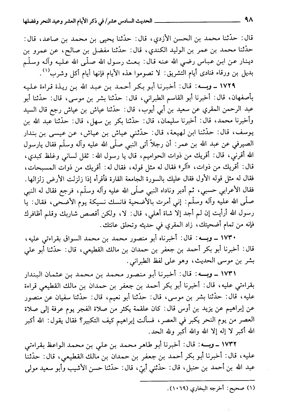 1731 - أَخْبَرَنَا أَبُو مَنْصُورٍ مُحَمَّدُ بْنُ مُحَمَّدِ بْنِ عُثْمَانَ الْبُنْدَارُ، بِقِرَاءَتِي عَلَيْهِ، قَالَ: أَخْبَرَنَا أَبُو بَكْرٍ أَحْمَدُ بْنُ جَعْفَرِ بْنِ حَمْدَانَ بْنِ مَالِكٍ الْقَطِيعِيُّ، قِرَاءَةً عَلَيْهِ، قَالَ: حَدَّثَنَا بِشْرُ بْنُ مُوسَى، قَالَ: حَدَّثَنَا أَبُو نُعَيْمٍ، قَالَ: حَدَّثَنَا سُفْيَانُ، عَنْ مَنْصُورٍ، عَنْ إِبْرَاهِيمَ، عَنْ يَزِيدَ بْنِ أَوْسٍ، قَالَ: كَانَ عَلْقَمَةُ يُكْثِرُ مِنْ صَلَاةِ الْفَجْرِ يَوْمَ عَرَفَةَ إِلَى صَلَاةِ الْعَصْرِ مِنْ يَوْمِ النَّحْرِ يُكَبِّرُ فِي الْعَصْرِ، فَسَأَلْتُ إِبْرَاهِيمَ كَيْفَ التَّكْبِيرُ؟ فَقَالَ يَقُولُ: اللَّهُ أَكْبَرُ اللَّهُ أَكْبَرُ لَا إِلَهَ إِلَّا اللَّهُ وَاللَّهُ أَكْبَرُ وَلِلَّهِ الْحَمْدُ.