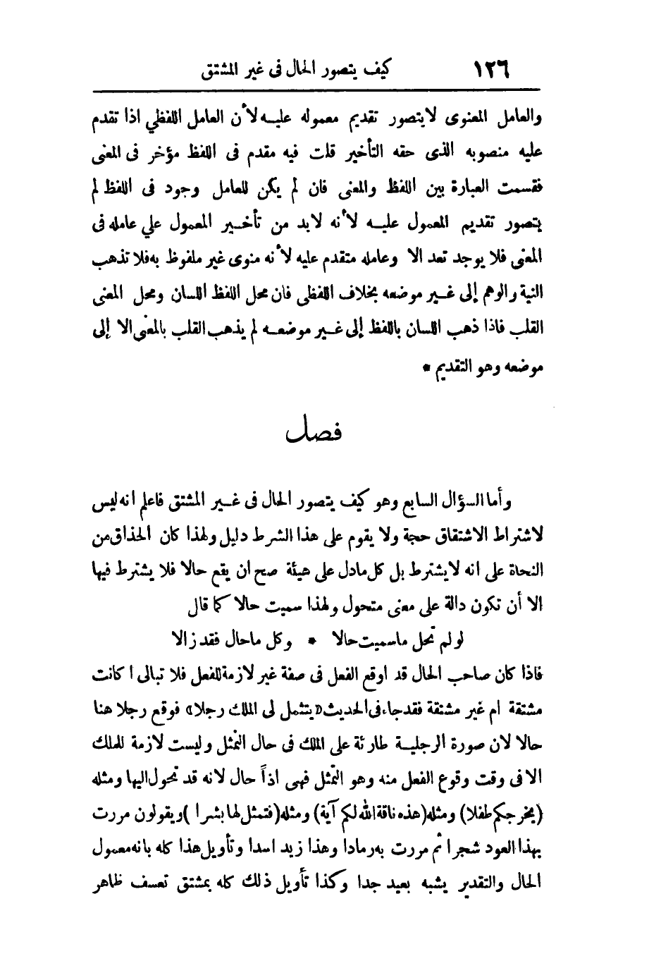 وأما السؤال السابع: وهو كيف يتصور الحال في غير المشتق فاعلم أنه ليس لاشتراط الاشتقاق حجة ولا يقوم على هذا الشرط دليل ولهذا كان الحذاق من النحاة على أنه لا يشترط بل كل ما دل على هيئة صح أن يقع حالا فلا يشترط فيها إلا أن تكون دالة على معنى متحول ولهذا سميت حالا كما قال: