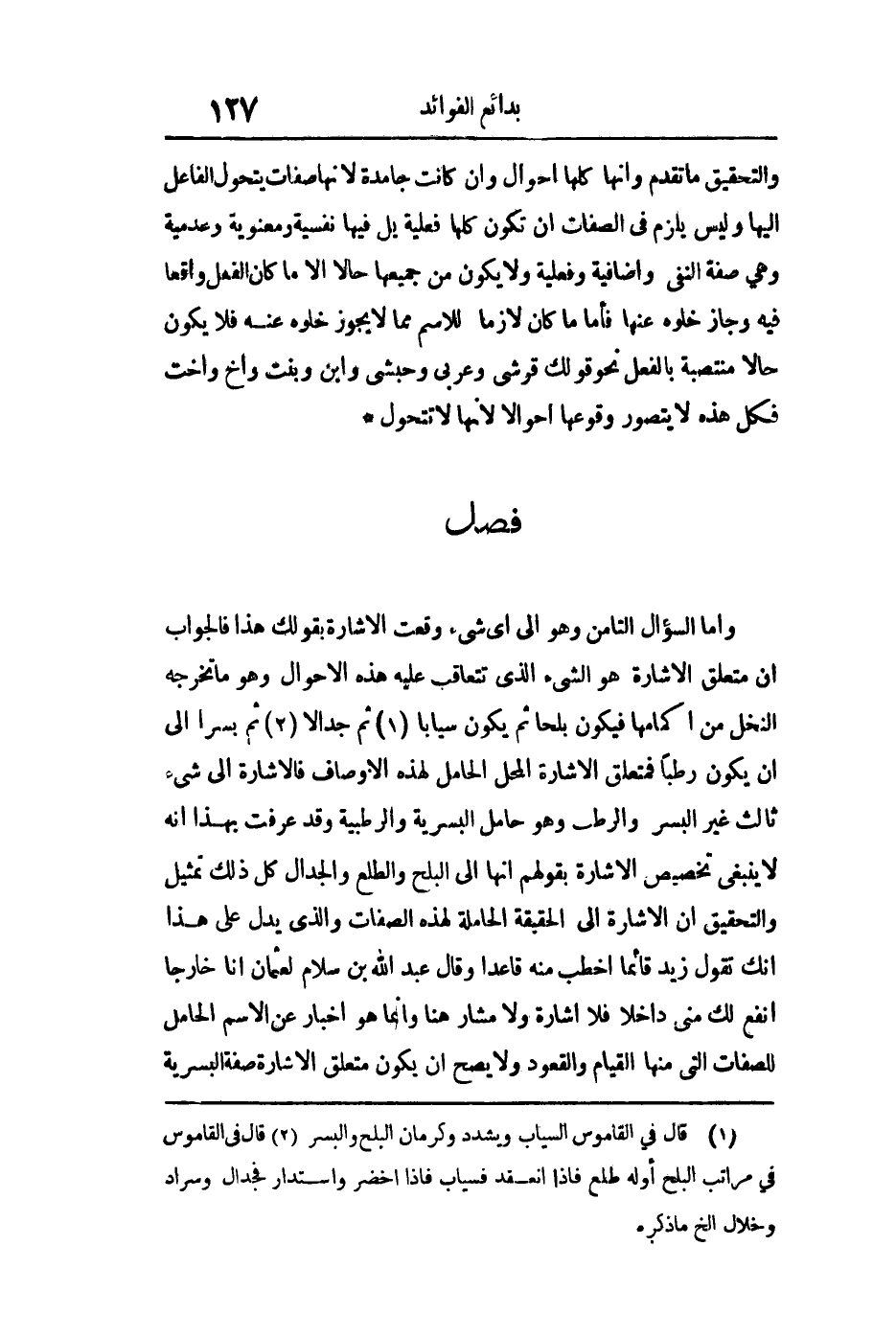 وأما السؤال الثامن: وهو إلى أي شيء وقعت الإشارة بقولك هذا فالجواب أن متعلق الإشارة هو الشيء الذي تتعاقب عليه هذه الأحوال وهو ما تخرجه النخل من أكمامها فيكون بلحا ثم يكون سيابا ثم جدالا ثم بسرا إلى أن يكون رطبا فمتعلق الإشارة المحل الحامل لهذه الأوصاف فالإشارة إلى شيء ثالث غير البسر والرطب وهو حامل البسرية والرطبة وقد عرفت بهذا أنه لا ينبغي تخصيص الإشارة بقولهم إنها إلى البلح والطلع والجدال كل ذلك تمثيل والتحقيق أن الإشارة إلى الحقيقة الحاملة لهذه الصفات والذي يدل على هذا أنك تقول زيد قائما أخطب منه قاعدا وقال عبد الله بن سلام لعثمان: "أنا خارجا أنفع لك مني" داخلا فلا إشارة ولا مشار هنا وإنما هو إخبار عن الاسم الحامل للصفات التي منها القيام والقعود ولا يصح أن يكون متعلق الإشارة صفة البسرية