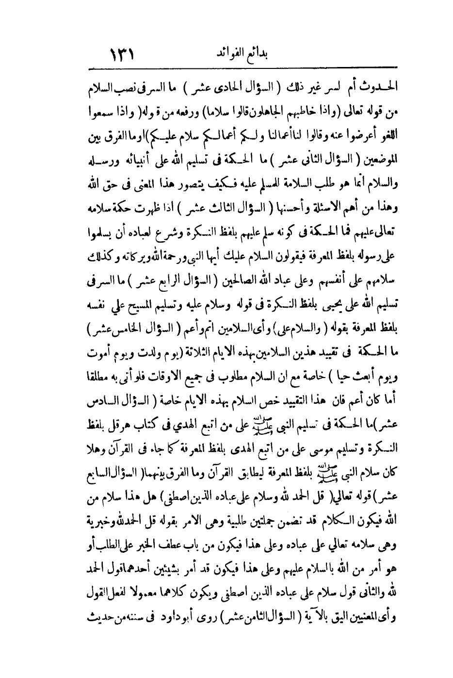 الحدوث أم لسر غير ذلك السؤال الحادي عشر: ما السر في نصب السلام من قوله تعالى: {وَإِذَا خَاطَبَهُمُ الْجَاهِلُونَ قَالُوا سَلاماً} ورفعه من قوله: {وَإِذَا سَمِعُوا اللَّغْوَ أَعْرَضُوا عَنْهُ وَقَالُوا لَنَا أَعْمَالُنَا وَلَكُمْ أَعْمَالُكُمْ سَلامٌ عَلَيْكُمْ} وما الفرق بين الموضعين السؤال الثاني عشر: ما الحكمة في تسليم الله على أنبيائه ورسله والسلام إنما هو طلب السلامة للمسلم عليه فكيف يتصور هذا المعنى في حق الله وهذا من أهم الأسئلة وأحسنها السؤال الثالث عشر: إذا ظهرت حكمة سلامه تعالى عليهم فما الحكمة في كونه سلم عليهم بلفظ النكرة وشرع لعباده أن يسلموا على رسوله بلفظ المعرفة فيقولون السلام عليك أيها النبي ورحمة الله وبركاته وكذلك سلامهم على أنفسهم وعلى عباد الله الصالحين السؤال الرابع عشر: ما السر في تسليم الله على يحيى بلفظ النكرة في قوله: {وَسَلامٌ عَلَيْهِ} وتسليم المسيح على نفسه بلفظ المعرفة بقوله: {وَالسَّلامُ عَلَيَّ} وأي السلامين أتم وأعم السؤال الخامس عشر: ما الحكمة في تقييد هذين السلامين بهذه الأيام الثلاثة {يَوْمَ وُلِدْتُ وَيَوْمَ أَمُوتُ وَيَوْمَ أُبْعَثُ حَيّاً} خاصة مع أن السلام مطلوب في جميع الأوقات فلو أتى به مطلقا أما كان أعم فإن هذا التقييد خص السلام بهذه الأيام خاصة السؤال السادس عشر: ما الحكمة في تسليم النبي صلى الله عليه وسلم على من اتبع الهدى في كتاب هرقل بلفظ النكرة وتسليم موسى على من اتبع الهدى بلفظ المعرفة كما جاء في القرآن وهلا كان سلام النبي صلى الله عليه وسلم بلفظ المعرفة ليطابق القرآن وما الفرق بينهما السؤال السابع عشر: قوله تعالى: {قُلِ الْحَمْدُ لِلَّهِ وَسَلامٌ عَلَى عِبَادِهِ الَّذِينَ اصْطَفَى} هل هذا سلام من الله فيكون الكلام قد تضمن جملتين طلبية وهي الأمر بقوله: {قُلِ الْحَمْدُ لِلَّهِ} وخبرية وهي سلامة تعالى على عباده وعلي هذا فيكون من باب عطف الخبر على الطلب أو هو أمر من الله بالسلام عليهم وعلى هذا فيكون قد أمر بشيئين أحدهما: قول الحمد لله والثاني: قول سلام على عباده الذين اصطفى ويكون كلاهما معمولا لفعل القول وأي المعنيين أليق بالآية السؤال الثامن عشر: روى أبو داود في سننه من حديث