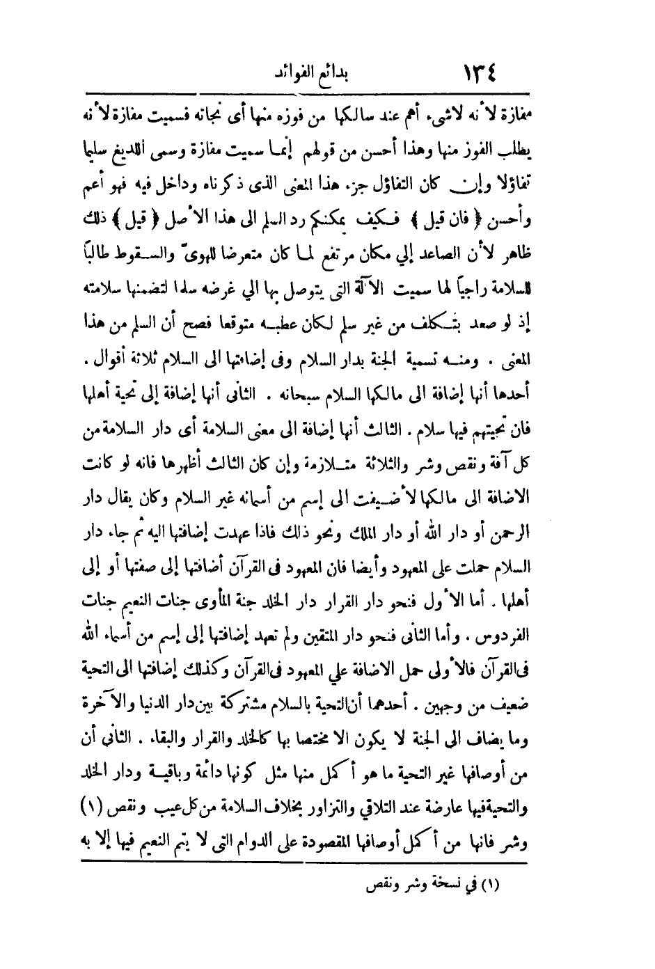 مفازة لأنه لا شيء أهم عند سالكها من فوزه منها أي نجاته فسميت مفازة لأنه يطلب الفوز منها وهذا أحسن من قولهم إنما سميت مفازة وسميت اللديغ سليما تفاؤلا وإن كان التفاؤل جزء هذا المعنى الذي ذكرناه وداخل فيه فهو أعم وأحسن فإن قيل: فكيف يمكنكم رد السلم إلى هذا الأصل قيل: ذلك ظاهر لأن الصاعد إلى مكان مرتفع لما كان متعرضا للهوي والسقوط طالبا للسلامة راجيا لها سميت الآلة التي يتوصل بها إلى غرضه سلما لتضمنها سلامته إذ لو صعد بتكلف من غير سلم لكان عطبه متوقعا فصح أن السلم من هذا المعنى ومنه تسمية الجنة بدار السلام وفي إضافتها إلى السلام ثلاثة أقوال أحدها أنها إضافة إلى مالكها السلام سبحانه الثاني أنها إضافة إلى تحية أهلها فإن تحيتهم فيها السلام الثالث أنها إضافة إلى معنى السلام أي دار السلام من كل آفة ونقص وشر والثلاثة متلازمة وإن كان الثالث أظهرها فإنه لو كانت الإضافة إلى مالكها لأضيفت إلى اسم من أسمائه غير السلام وكان يقال دار الرحمن أو دار الله أو دار الملك ونحو ذلك فإذا عهدت إضافتها إليه ثم جاء دار السلام حملت على المعهود وأيضا فإن المعهود في القرآن إضافتها إلى صفتها أو إلى أهلها أما الأول: فنحو دار القرار دار المجد جنة المأوى جنات النعيم جنات الفردوس وأما الثاني: فنحو دار المتقين ولم تعهد إضافتها إلى اسم من أسماء الله تعالى في القرآن فالأولى حمل الإضافة على المعهود في القرآن وكذلك إضافتها إلى التحية ضعيف من وجهين أحدهما: أن التحية بالسلام مشتركة بين دار الدنيا والآخرة وما يضاف إلى الجنة لا يكون إلا مختصا بها كالخلد والقرار والبقاء الثاني: أن من أوصافها غير التحية ما هو أكمل منها مثل كونها دائمة وباقية ودار الخلد والتحية فيها عارضة عند التلاقي والتزاور بخلاف السلامة من كل عيب ونقص وشر فإنها من أكمل أوصافها المقصودة على الدوام التي لا يتم النعيم فيها إلا به