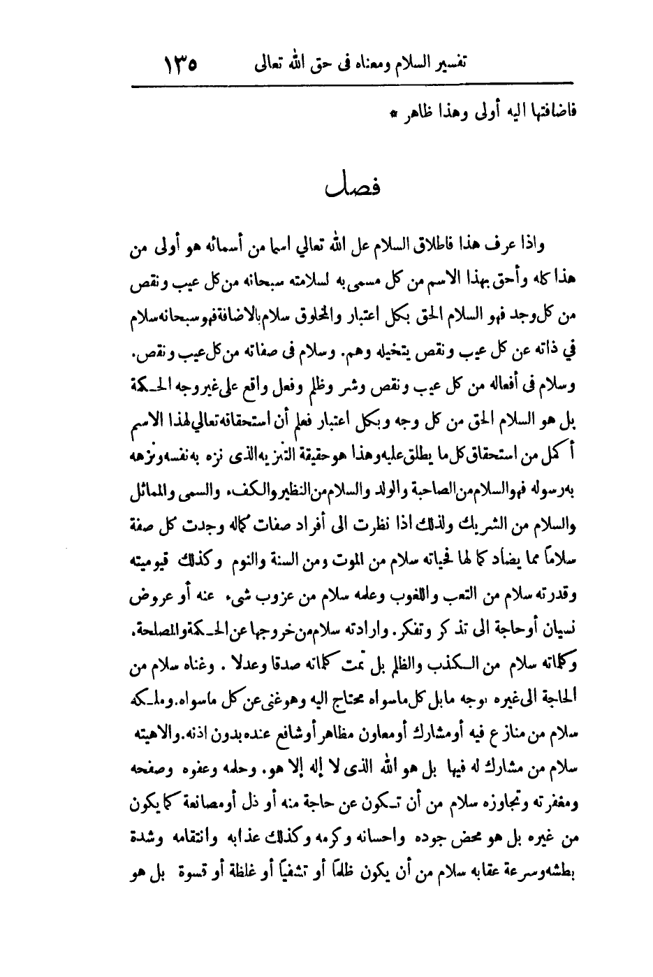 وإذا عرفت هذان فإطلاق السلام على الله تعالى اسما من أسمائه هو أولى من هذا كله وأحق بهذا الاسم من كل مسمى به لسلامته سبحانه من كل عيب ونقص من كل وجد فهو السلام الحق بكل اعتبار والمخلوق سلام بالإضافة فهو سبحانه سلام في ذاته عن كل عيب ونقص يتخيله وهم وسلام في صفاته من كل عيب ونقص وسلام في أفعاله من كل عيب ونقص وشر وظلم وفعل واقع على غير وجه الحكمة بل هو السلام الحق من كل وجه وبكل اعتبار فعلم أن استحقاقه تعالى لهذا الاسم أكمل من استحقاق كل ما يطلق عليه وهذا هو حقيقة التنزيه الذي نزه به نفسه ونزهه به رسوله فهو السلام من الصاحبة والولد والسلام من النظير والكفء والسمي والمماثل والسلام من الشريك ولذلك إذا نظرت إلى أفراد صفات كماله وجدت كل صفة سلاما مما يضاد كمالها فحياته سلام من الموت ومن السنة والنوم وكذلك قيوميته وقدرته سلام من التعب واللغوب وعلمه سلام من عزوب شيء عنه أو عروض نسيان أو حاجة إلى تذكر وتفكر وإرادته سلام من خروجها عن الحكمة والمصلحة وكلماته سلام من الكذب والظلم بل تمت كلماته صدقا وعدلا وغناه سلام من الحاجة إلى غيره بوجه ما بل كل ما سواه محتاج إليه وهو غني عن كل ما سواه وملكه سلام من منازع فيه أو مشارك أو معاون مظاهر أو شافع عنده بدون إذنه وإلهيته سلام من مشارك له فيها بل هو الله الذي لا إله إلا هو وحلمه وعفوه وصفحه ومغفرته وتجاوزه سلام من أن تكون عن حاجة منه أو ذلك أو مصانعة كما يكون من غيره بل هو محض جوده وإحسانه وكرمه وكذلك عذابه وانتقامه وشدة بطشه وسرعة عقابه سلام من أن يكون ظلما أو تشفيا أو غلظة أو قسوة بل هو