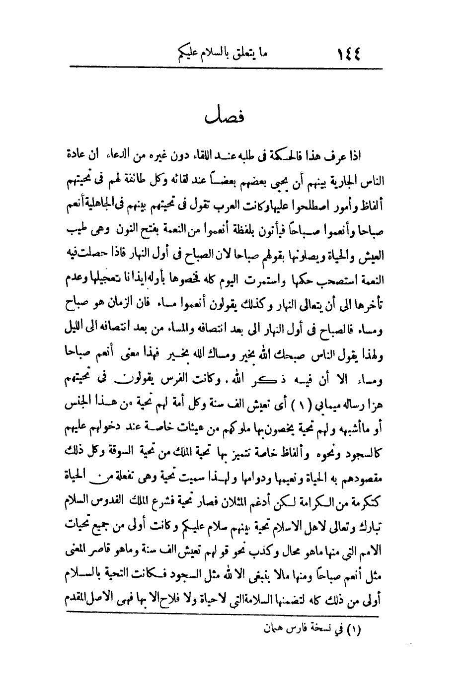 إذا عرف هذا فالحكم في طلبه عند اللقاء دون غير من الدعاء أن عادة الناس الجارية بينهم أن يحيي بعضهم بعضا عند لقائه وكل طائفة لهم في تحيتهم ألفاظ وأمور اصطلحوا عليها وكانت العرب تقول في تحيتهم بينهم في الجاهلية أنعم صباحا وأنعموا صباحا فيأتون بلفظة أنعموا من النعمة بفتح النون وهي طيب العيش والحياة ويصلونها بقولهم صباحا لأن الصباح في أول النهار فإذا حصلت فيه النعمة استصحب حكمها واستمرت اليوم كله فخصوها بأوله إيذانا بتعجيلها وعدم تأخرها إلى أن يتعالى النهار وكذلك يقولون أنعموا مساء فإن الزمان هو صباح ومساء فالصباح في أول النهار إلى بعض انتصافه والمساء من بعد انتصافه إلى الليل ولهذا يقول الناس صبحك الله بخير ومساك الله بخير فهذا معنى أنعم صباحا ومساء إلا أن فيه ذكر الله وكانت الفرس يقولون في تحيتهم هزا رساله ميمايي أي تعيش ألف سنة وكل أمة لهم تحية من هذا الجنس أو ما أشبهه ولهم تحية يخصون بها ملوكهم من هيئات خاصة عند دخولهم عليهم كالسجود ونحوه وألفاظ خاصة تتميز بها تحية الملك من تحية السوقة وكل ذلك مقصودهم به الحياة ونعيمها ودوامها ولهذا سميت تحية وهي تفعلة من الحياة كتكرمة من الكرامة لكن أدغم المثلان فصار تحية فشرع الملك القدوس السلام تبارك وتعالى لأهل الإسلام تحية بينهم سلام عليكم وكانت أولى من جميع تحيات الأمم التي منها ما هو محال وكذب نحو قولهم تعيش ألف سنة وما هو قاصر المعنى مثل أنعم صباحا ومنها ما لا ينبغي إلا لله مثل السجود فكانت التحية بالسلام أولى من ذلك كله لتضمنها السلامة التي لا حياة ولا فلاح إلا بها فهي الأصل المقدم