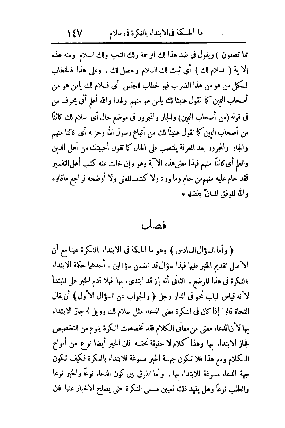 وأما السؤال السادس: وهو ما الحكمة في الابتداء بالنكرة هاهنا مع أن الأصل تقديم الخبر عليها فهذا سؤال قد تضمن سؤالين أحدهما: حكمة الابتداء بالنكرة في هذا الموضع، الثاني: أنه إذ قد ابتدئ بها فهلا قدم الخبر على المبتدأ لأنه قياس الباب نحو: في الدار رجل والجواب عن السؤال الأول: أن يقال إن النحاة قالوا: إذا كان في النكرة معنى الدعاء مثل سلام لك وويل له جاز الابتداء بها لأن الدعاء معنى من معاني الكلام فقد تخصصت النكرة بنوع من التخصيص فجاز الابتداء بها وهذا كلام لا حقيقة تحته فإن الخبر أيضا نوع من أنواع الكلام ومع هذا فلا تكون جهة الخبر مسوغة للابتداء بالنكرة فكيف تكون جهة الدعاء مسوغة للابتداء بها وأما الفرق بين كون الدعاء نوعا والخبر نوعا والطلب نوعا وهلا يفيد ذلك تعيين مسمى النكرة حتى يصلح الإخبار عنها فإن