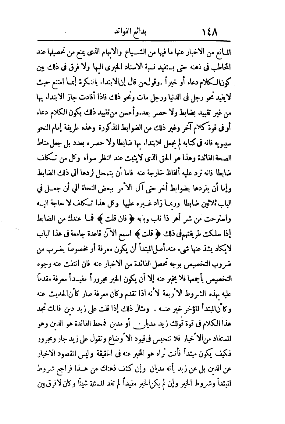 المانع من الإخبار عنها ما فيها من الشياع والإبهام الذي يمنع من تحصيلها عند المخاطب في ذهنه حتى يستفيد نسبة الإسناد الخبري إليها ولا فرق في ذلك بين كون الكلام دعاء أو خبرا وقول من قال: إن الابتداء بالنكرة إنما امتنع حيث لا يفيد نحو رجل في الدنيا ورجل مات ونحو ذلك فإذا أفادت جاز الابتداء بها من غير تقييد بضابط ولا حصر بعد وأحسن من تقييد ذلك بكون الكلام دعاء أو في قوة الكلام آخر وغير ذلك من الضوابط المذكورة وهذه طريقة إمام النحو سيبويه فإنه في كتابه لم يجعل للابتداء بها ضابطا ولا حصره بعدد بل جعل مناط الصحة الفائدة وهذا هو الحق الذي لا يثبت عند النظر سواه وكل من تكلف ضابطا فإنه ترد عليه ألفاظ خارجة عنه فإما أن يتمحل لردها إلى ذلك الضابط وإما أن يفردها بضوابط أخرى حتى آل الأمر ببعض النحاة إلى أن جعل في الباب ثلاثين ضابطا وربما زاد غيره عليها وكل هذا تكلف لا حاجة إليه واسترحت من شر أهر ذا ناب وبابه قاعدة جامعة في الابتداء فإن قلت: فما عندك من الضابط إذا سلكت طريقتهم في ذلك قلت: اسمع الآن قاعدة جامعة في هذا الباب لا يكاد يشذ عنها شيء منه أصل المبتدأ أن يكون معرفة أو مخصوصا بضرب من ضروب التخصيص بوجه تحصل الفائدة من الإخبار عنه فإن انتفت عنه وجوه التخصيص بأجمعها فلا يخبر عنه إلا أن يكون الخبر مجرورا مفيدا معرفة مقدما عليه بهذه الشروط الأربعة لأنه إذا تقدم وكان معرفة صار كأن الحديث عنه وكأن المبتدأ المؤخر خبر عنه ومثال ذلك إذا قلت: على زيد دين فإنك تجد هذا الكلام في قوة قولك زيد مديان أو مدين فمحط الفائدة هو الدين وهو المستفاد من الإخبار فلا تنحس في قيود الأوضاع وتقول على زيد جار ومجرور فكيف يكون مبتدأ فأنت تراه هو المخبر عنه في الحقيقة وليس المقصود الإخبار عن الدين بل عن زيد بأنه مديان وإن كثف ذهنك عن هذا فراجع شروط المبتدأ وشروط الخبر وإن لم يكن الخبر مفيدا لم تفد المسألة شيئا وكان لا فرق بين