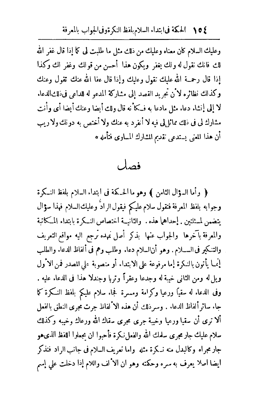 وأما السؤال الثامن: وهو ما الحكمة في ابتداء السلام بلفظ النكرة وجوابه بلفظ المعرفة فتقول سلام عليكم فيقول الراد وعليك السلام فهذا سؤال يتضمن لمسألتين إحداهما: هذه والثانية: اختصاص النكرة بابتداء المكاتبة والمعرفة بآخرها والجواب عنها بذكر أصل نمهده ترجع إليه مواقع التعريف والتنكير في السلام وهو أن السلام دعاء وطلب وهم في ألفاظ الدعاء والطلب إنما يأتون بالنكرة إما مرفوعة على الابتداء أو منصوبة على المصدر فمن الأول: ويل له ومن الثاني: خيبة له وجدعا وعقرا وتربا وجندلا وهذا في الدعاء عليه وفي الدعاء له سقيا ورعيا وكرامة ومسرة فجاء سلام عليكم بلفظ النكرة كما جاء سائر ألفاظ الدعاء وسر ذلك أن هذه الألفاظ جرت مجرى النطق بالفعل ألا ترى أن سقيا ورعيا وخيبة جرى مجرى سقاك الله ورعاك وكذلك سلام عليك جار مجرى سلمك الله والفعل نكرة فأحبوا أن يجعلوا اللفظ الذي هو جار مجراه وكالبدل منه نكرة مثله وأما تعريف السلام في جانب الراد فنذكر أيضا أصلا يعرف به سره وحكمته وهو أن الألف واللام إذا دخلت على اسم