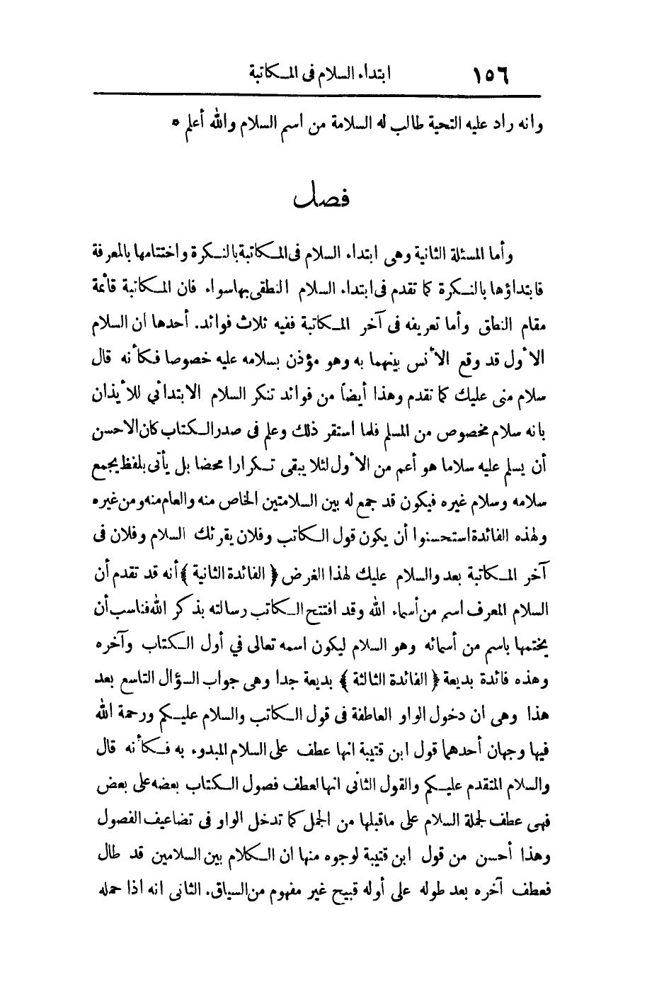 وأما المسألة الثانية: وهي ابتداء السلام في المكاتبة بالنكرة واختتامها بالمعرفة فابتداؤها بالنكرة كما تقدم في ابتداء السلام النطقي بها سواء فإن المكاتبة قائمة مقام النطق وأما تعريفه في آخر المكاتبة ففيه ثلاث فوائد أحدها: أن السلام الأول قد وقع الأنس بينهما به وهو مؤذن بسلامه عليه خصوصا فكأنه قال سلام مني عليك كما تقدم وهذا أيضا من فوائد تنكر السلام الابتدائي للإيذان بأنه سلام مخصوص من المسلم فلما استقر ذلك وعلم في صدر الكتاب كان الأحسن أن يسلم عليه سلاما وهو أعم من الأول لئلا يبقى تكرارا محضا بل يأتي بلفظ يجمع سلامه وسلام غيره فيكون قد جمع له بين السلامين الخاص منه والعام منه ومن غيره ولهذه الفائدة استحسنوا أن يكون قول الكاتب وفلان يقرئك السلام وفلان في آخر المكاتبة بعد والسلام عليك لهذا الغرض الفائدة الثانية: أنه قد تقدم أن السلام المعرف اسم من أسماء الله وقد افتتح الكاتب رسالته بذكر الله فناسب أن يختمها باسم من أسمائه وهو السلام ليكون اسمه تعالى في أول الكتاب وآخره وهذه فائدة بديعة الفائدة الثالثة: ب ديعة جدا وهي جواب السؤال التاسع بعد هذا وهي أن دخول الواو العاطفة في قول الكاتب والسلام عليكم ورحمة الله فيها وجهان أحدهما: قول ابن قتيبة: أنها عطف على السلام المبدوء به فكأنه قال والسلام المتقدم عليكم. والقول الثاني: إنها لعطف فصول الكتاب بعضه على بعض فهي عطف لجملة السلام على ما قبلها من الجمل كما تدخل الواو في تضاعيف الفصول. وهذا أحسن من قول ابن قتيبة لوجوه منها: أن الكلام بين السلامين قد طال فعطف آخره بعد طوله على أوله قبيح غير مفهوم من السياق الوجه الثاني: أنه إذا حمله