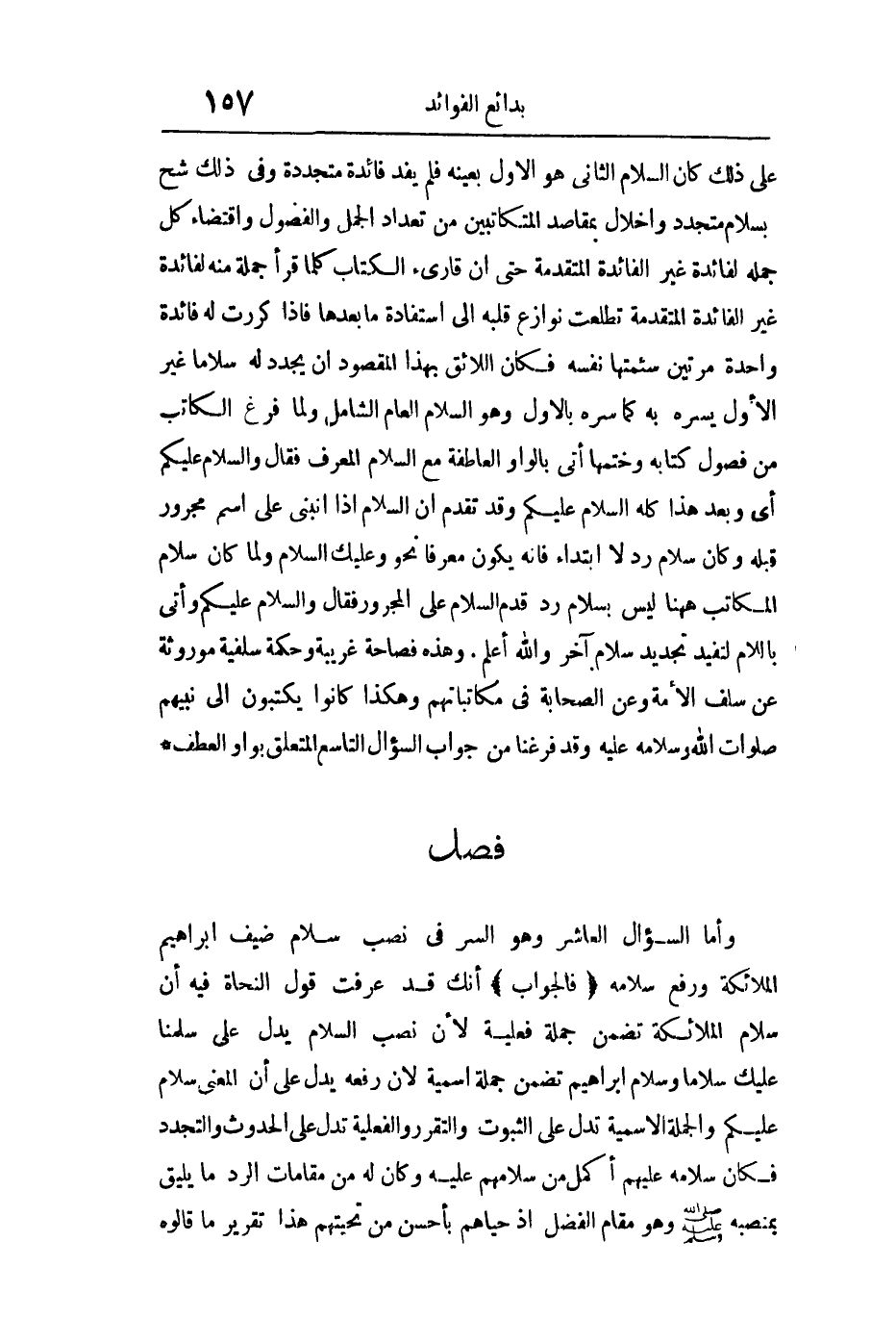 وأما السؤال العاشر: وهو السر في نصب سلام ضيف إبراهيم الملائكة ورفع سلامه فالجواب: أنك قد عرفت قول النحاة فيه أن سلام الملائكة تضمن جملة فعلية لأن نصب السلام يدل على سلمنا عليك سلاما وسلام إبراهيم تضمن جملة اسمية لأن رفعه يدل على أن المعنى سلام عليكم والجملة الاسمية تدل على الثبوت والتقرر والفعلية تدل على الحدوث والتجدد فكان سلامه عليهم أكمل من سلامهم عليه وكان له من مقامات الرد ما يليق بمنصبه صلى الله عليه وسلم وهو مقام الفضل إذ حياهم بأحسن من تحيتهم هذا تقرير ما قالوه