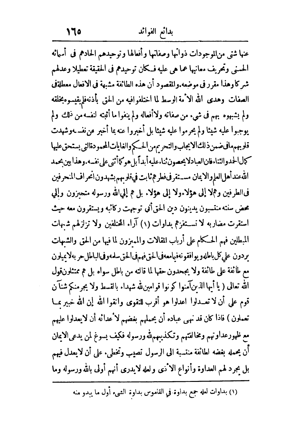 عنها شيء من الموجودات ذواتها وصفاتها وأفعالها وتوحيدهم إلحادهم في أسمائه الحسنى وتحريف معانيها عما هي عليه فكان توحيدهم في الحقيقة تعطيلا وعدلهم شركا وهذا مقرر في موضعه والمقصود أن هذه الطائفة مشبهة في الأفعال معطلة في الصفات وهدى الله الأمة الوسط لما اختلفوا فيه من الحق بإذنه فلم يقيسوه بخلقه ولم يشبهوه بهم في شيء من صفاته ولا أفعاله ولم ينفوا ما أثبته لنفسه من ذلك ولم يوجبوا عليه شيئا ولم يحرموا عليه شيئا بل أخبروا عنه بما أخبر عن نفسه وشهدت قلوبهم ما في ضمن ذلك الإيجاب والتحريم من الحكم والغايات المحمودة التي يستحق عليها كمال الحمد والثناء فإن العباد لا يحصون ثناء عليه أبدا بل هو كما أثنى على نفسه وهذا بين بحمد الله عند أهل العلم والإيمان مستقر في فطرهم ثابت في قلوبهم يشهدون انحراف المنحرفين في الطرفين وهم لا إلى هؤلاء ولا إلى هؤلاء بل هم إلى الله تعالى ورسوله متحيزون وإلى محض سنته منتسبون يدينون دين الحق أنى توجهت ركائبه ويستقرون معه حيث استقرت مضاربه لا تستفزهم بدوات آراء المختلفين ولا تزلزلهم شبهات المبطلين فهم الحكام على أرباب المقالات والمميزون لما فيها من الحق والشبهات يردون على كل باطلة ويوافقونه فيما معه في الحق فهم في الحق سلمه وفي الباطل حربه لا يميلون مع طائفة على طائفة ولا يجحدون حقها لما قالته من باطل سواه بل هم ممتثلون قول الله تعالى يا أيها الذين آمنوا كونوا قوامين لله شهداء بالقسط ولا يجرمنكم شنآن قوم على أن لا تعدلوا اعدلوا هو أقرب للتقوى واتقوا الله إن الله خبير بما تعملون المائدة 8 فإذا كان قد نهى عباده أن يحملهم بغضهم لأعدائه أن لا يعدلوا عليهم مع ظهور عداوتهم ومخالفتهم وتكذيبهم لله ورسوله فكيف يسوغ لمن يدعي الإيمان أن يحلمه بغضه لطائفة منتسبة إلى الرسول تصيب وتخطيء على أن لا يعدل فيهم بل يجرد لهم العداوة وأنواع الأذى ولعله لا يدري أنهم أولى بالله ورسوله وما